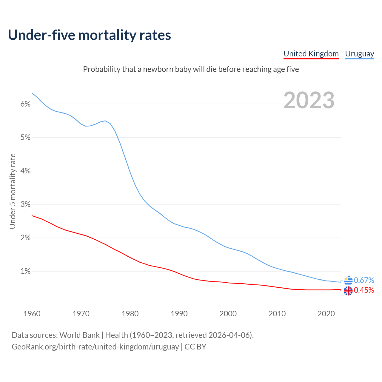 The chance that a newborn baby will die before reaching age five is 0.45% in the United Kingdom and 0.67% in Uruguay. Above is a chart with historical data on under-five mortality rates.