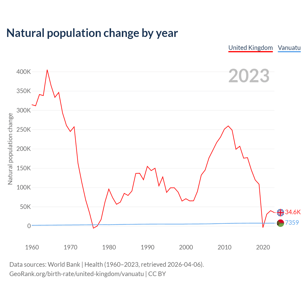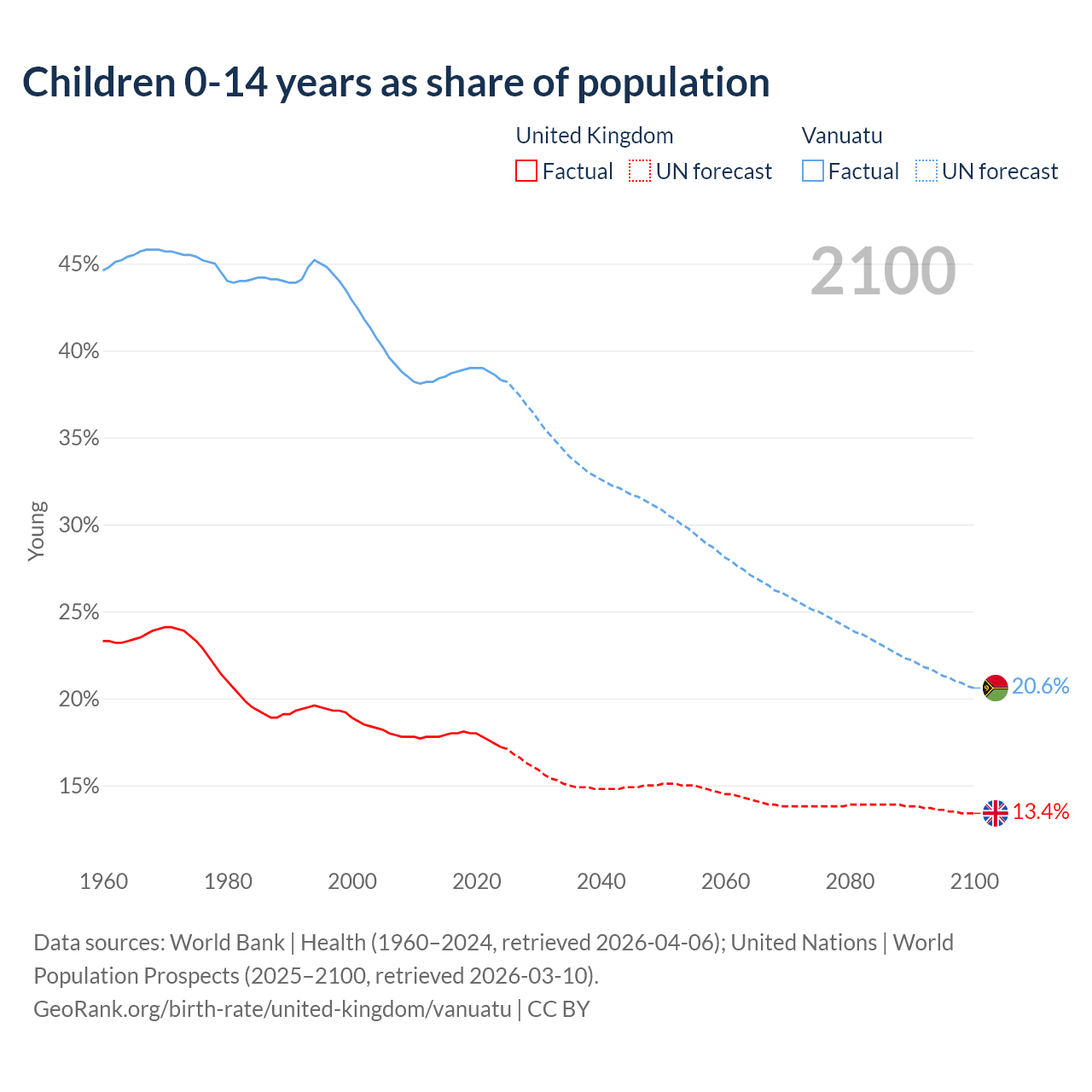 The United Kingdom has an annual birth rate of 10 births per 1,000 people, compared to 28.1 for Vanuatu. The average number of children a woman is expected to have during her lifetime — the fertility rate, is 1.56 in the United Kingdom and 3.6 in Vanuatu — 130.5% difference.