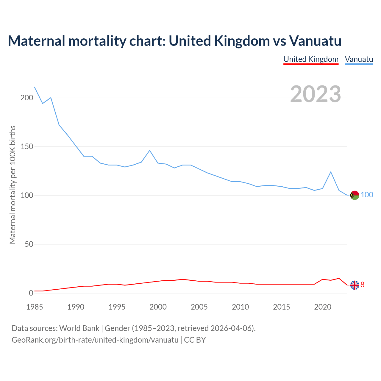 The maternal mortality rate, which is the probability of dying during childbirth or within 42 days of pregnancy termination, is 8 deaths per 100,000 live births in the United Kingdom, compared to 100 deaths in Vanuatu.