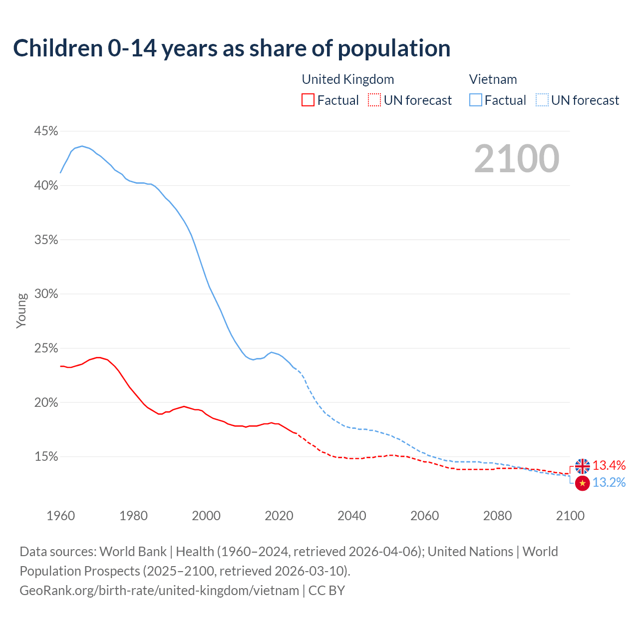 According to the latest available data on birth rates, the fertility rate in the United Kingdom was 1.56 children per woman in 2023, compared to 1.91 in Vietnam in 2023. The replacement level is considered to be 2.1 children per woman.