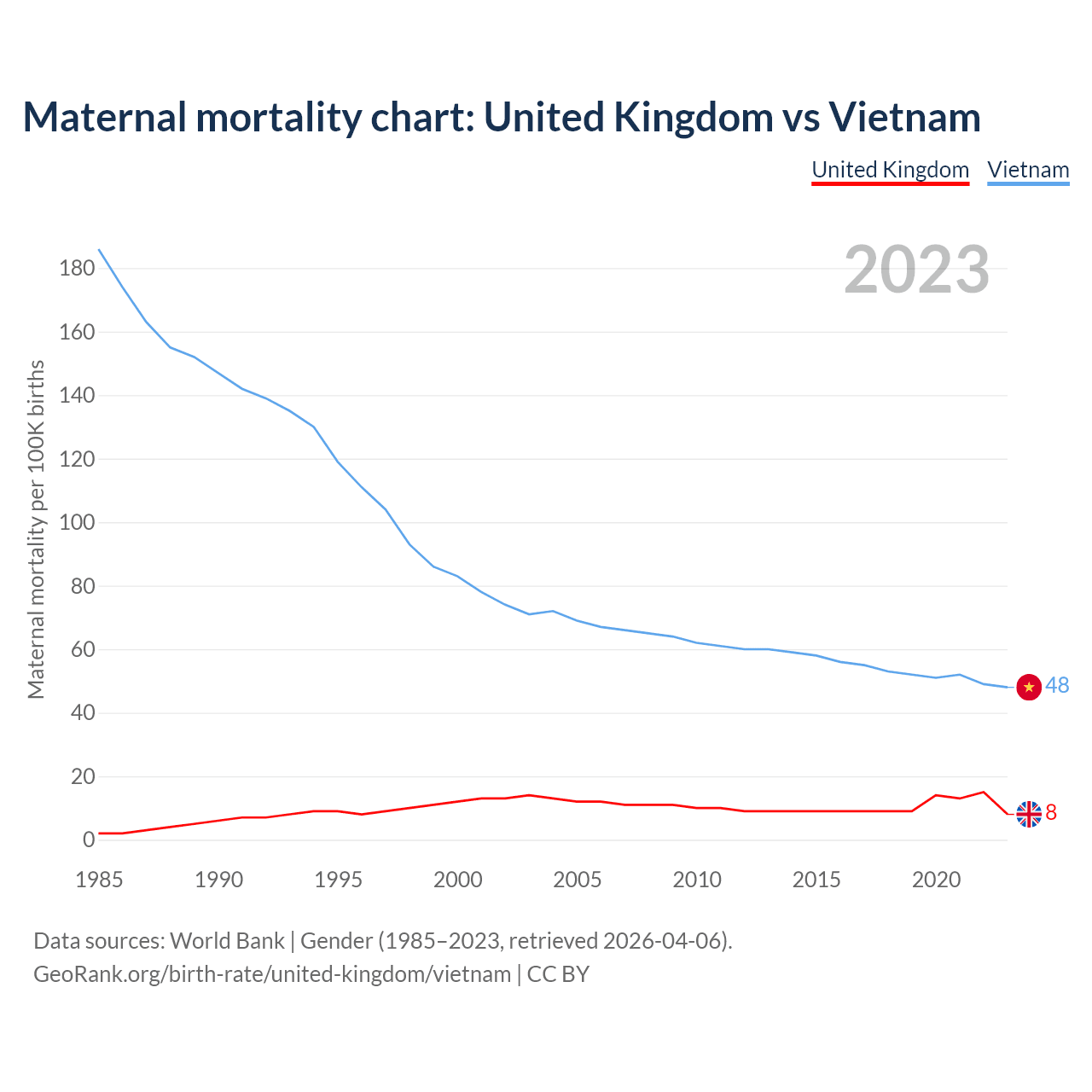 The maternal mortality rate, which is the probability of dying during childbirth or within 42 days of pregnancy termination, is 8 deaths per 100,000 live births in the United Kingdom, compared to 48 deaths in Vietnam.