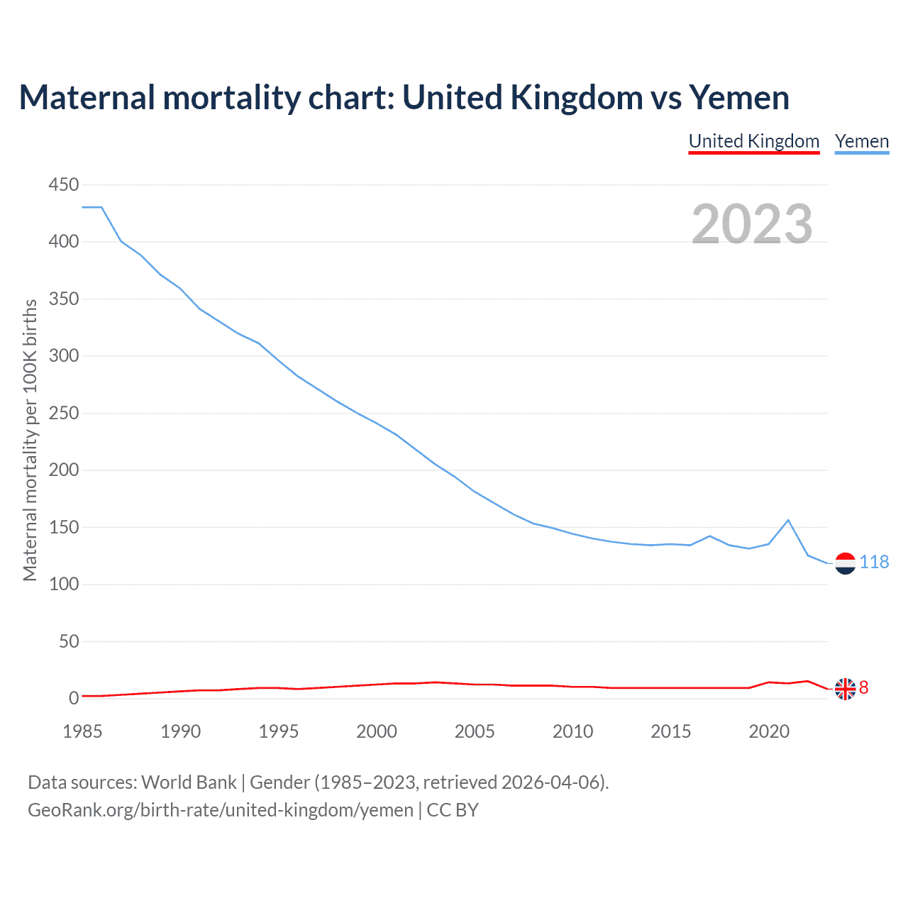 The maternal mortality rate, which is the probability of dying during childbirth or within 42 days of pregnancy termination, is 8 deaths per 100,000 live births in the United Kingdom, compared to 118 deaths in Yemen.