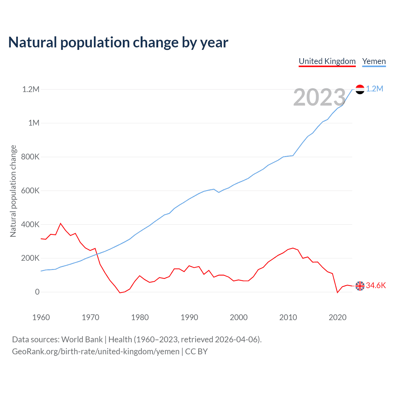 The United Kingdom has an annual birth rate of 10 births per 1,000 people, compared to 35.2 for Yemen. The average number of children a woman is expected to have during her lifetime — the fertility rate, is 1.56 in the United Kingdom and 4.59 in Yemen — 194.2% difference.