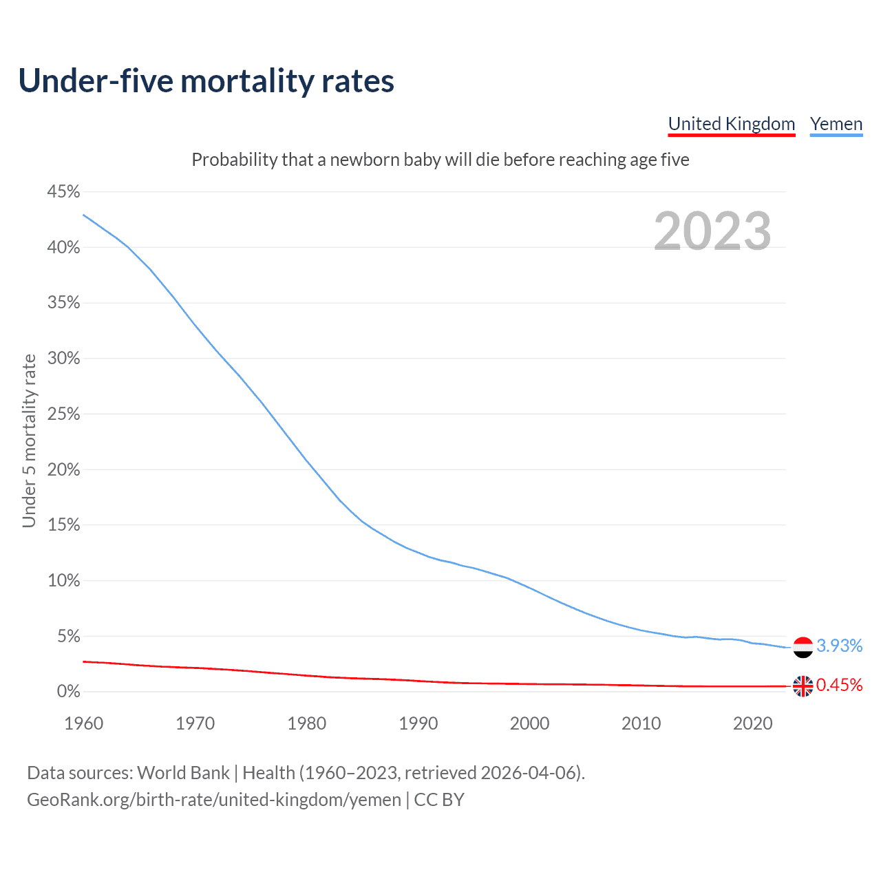 The chance that a newborn baby will die before reaching age five is 0.45% in the United Kingdom and 3.93% in Yemen. Above is a chart with historical data on under-five mortality rates.