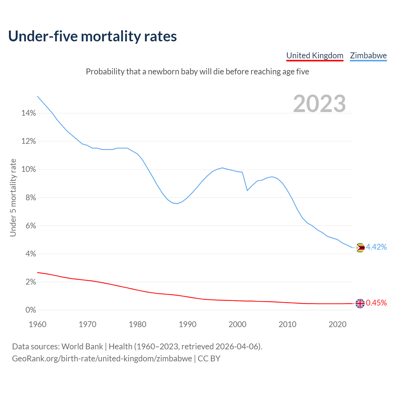 The chance that a newborn baby will die before reaching age five is 0.45% in the United Kingdom and 4.42% in Zimbabwe. Above is a chart with historical data on under-five mortality rates.