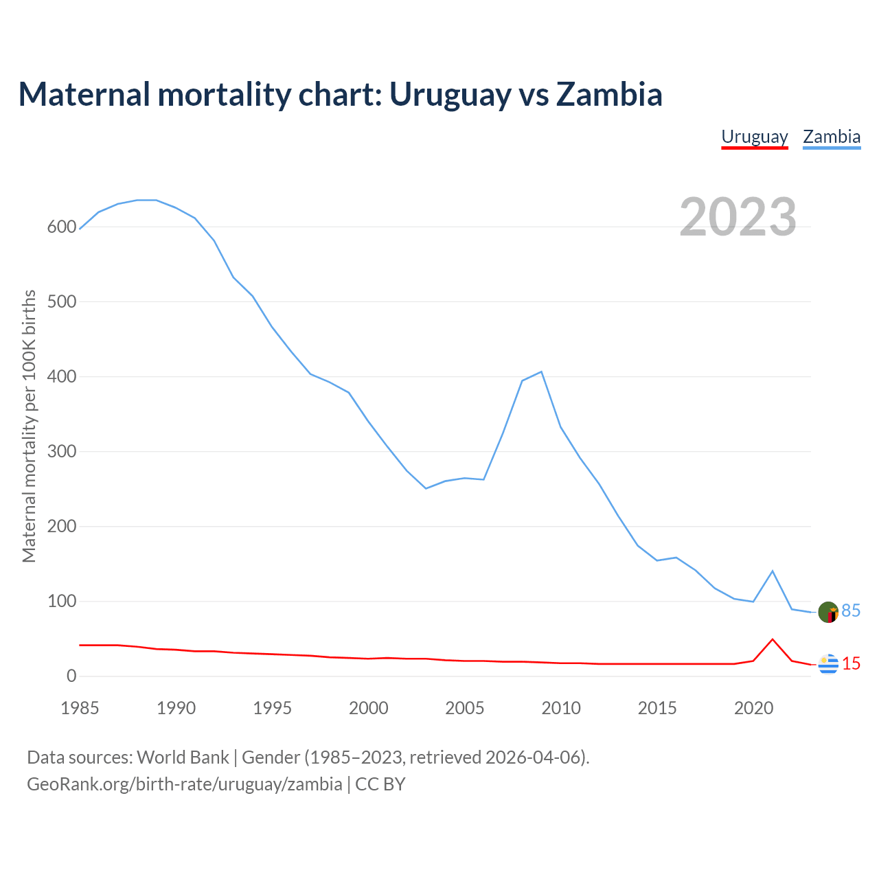 The maternal mortality rate, which is the probability of dying during childbirth or within 42 days of pregnancy termination, is 15 deaths per 100,000 live births in Uruguay, compared to 85 deaths in Zambia.