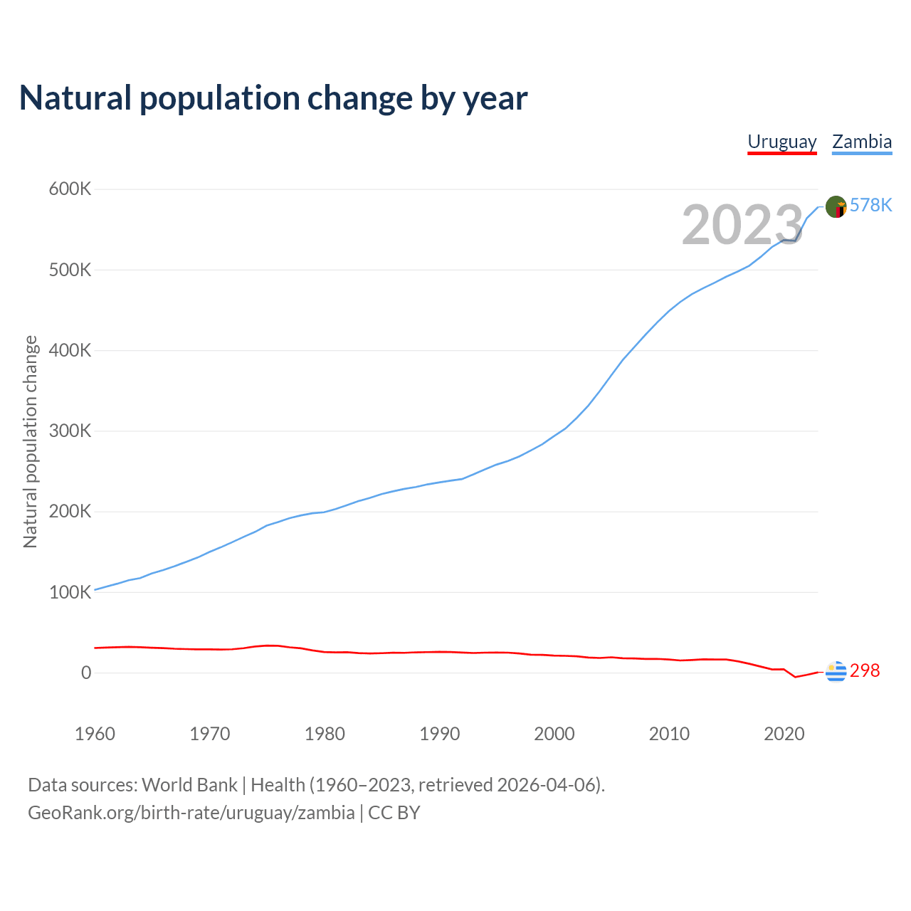 Uruguay has an annual birth rate of 9.87 births per 1,000 people, compared to 33.1 for Zambia. The average number of children a woman is expected to have during her lifetime — the fertility rate, is 1.41 in Uruguay and 4.1 in Zambia — 191.1% difference.