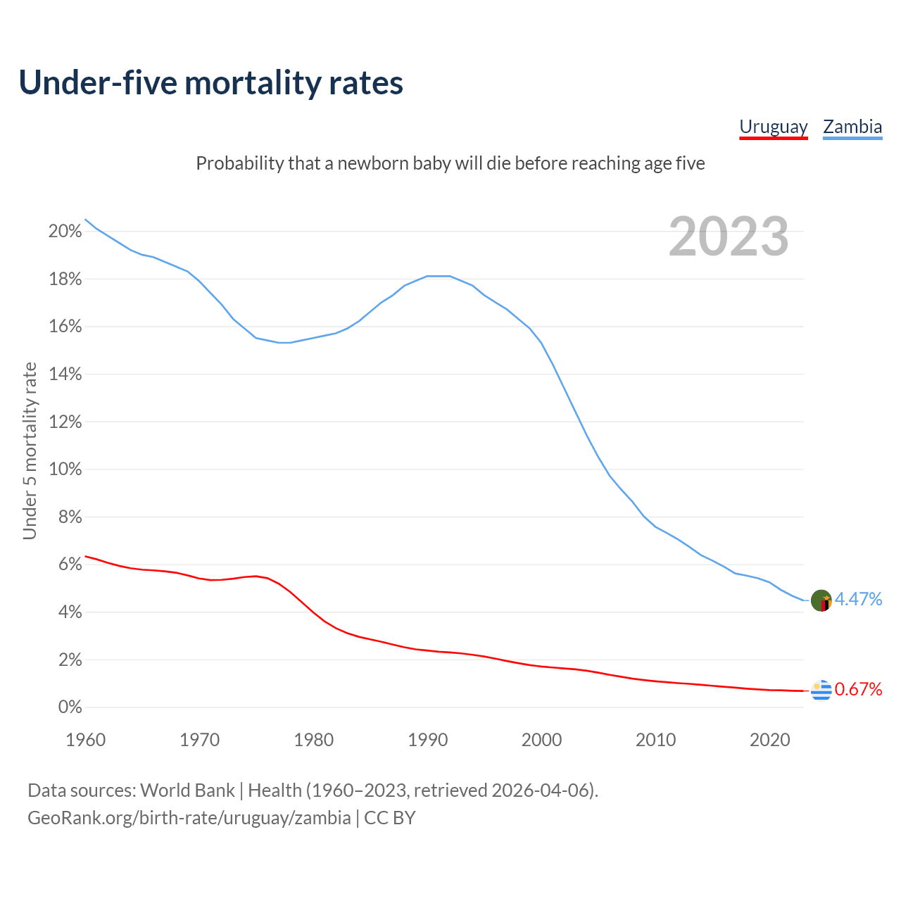 The chance that a newborn baby will die before reaching age five is 0.67% in Uruguay and 4.47% in Zambia. Above is a chart with historical data on under-five mortality rates.