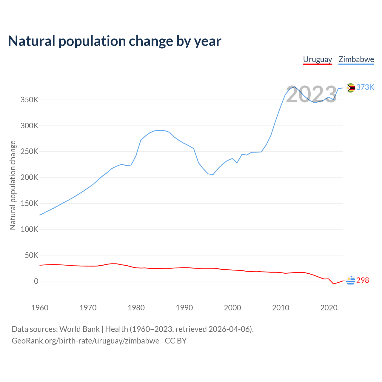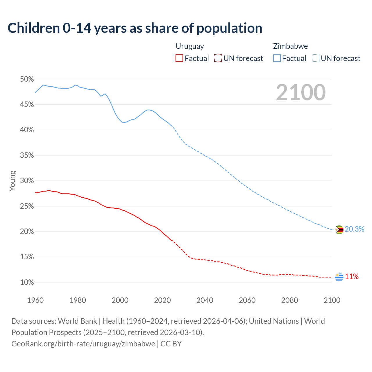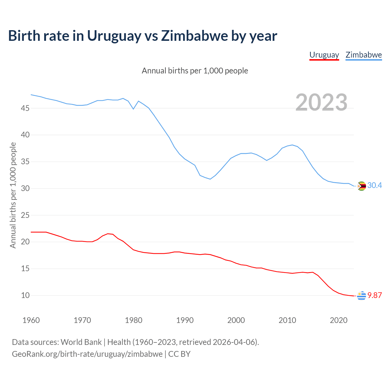 Uruguay has an annual birth rate of 9.87 births per 1,000 people, compared to 30.4 for Zimbabwe. The average number of children a woman is expected to have during her lifetime — the fertility rate, is 1.41 in Uruguay and 3.72 in Zimbabwe — 164.3% difference.