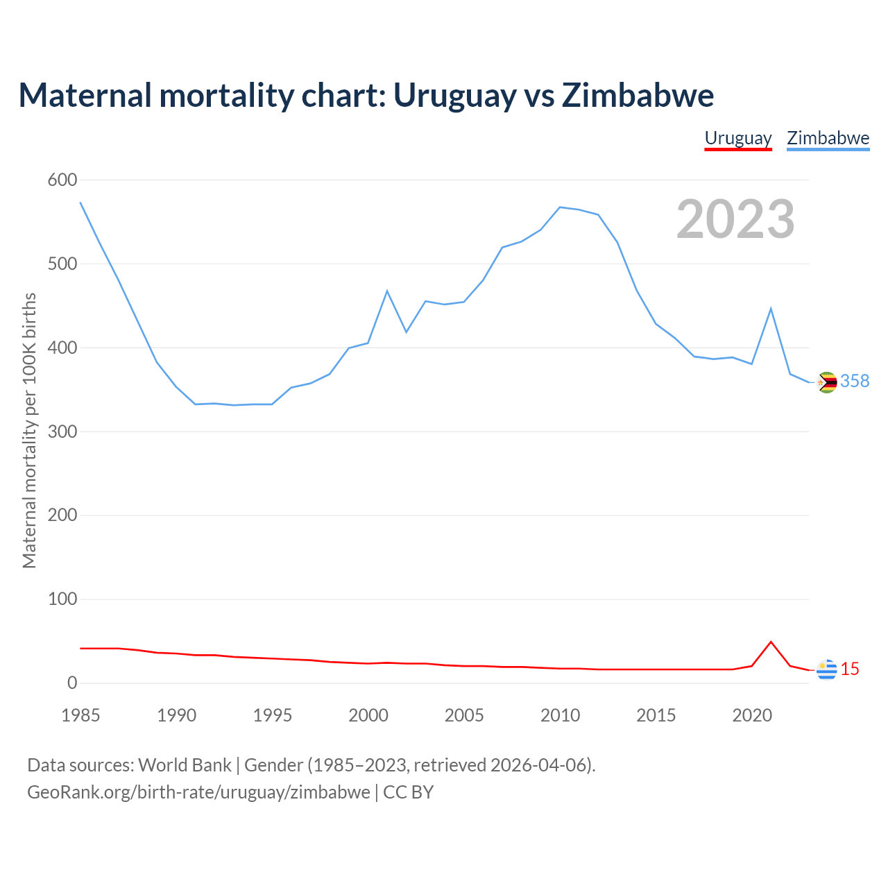The maternal mortality rate, which is the probability of dying during childbirth or within 42 days of pregnancy termination, is 15 deaths per 100,000 live births in Uruguay, compared to 358 deaths in Zimbabwe.