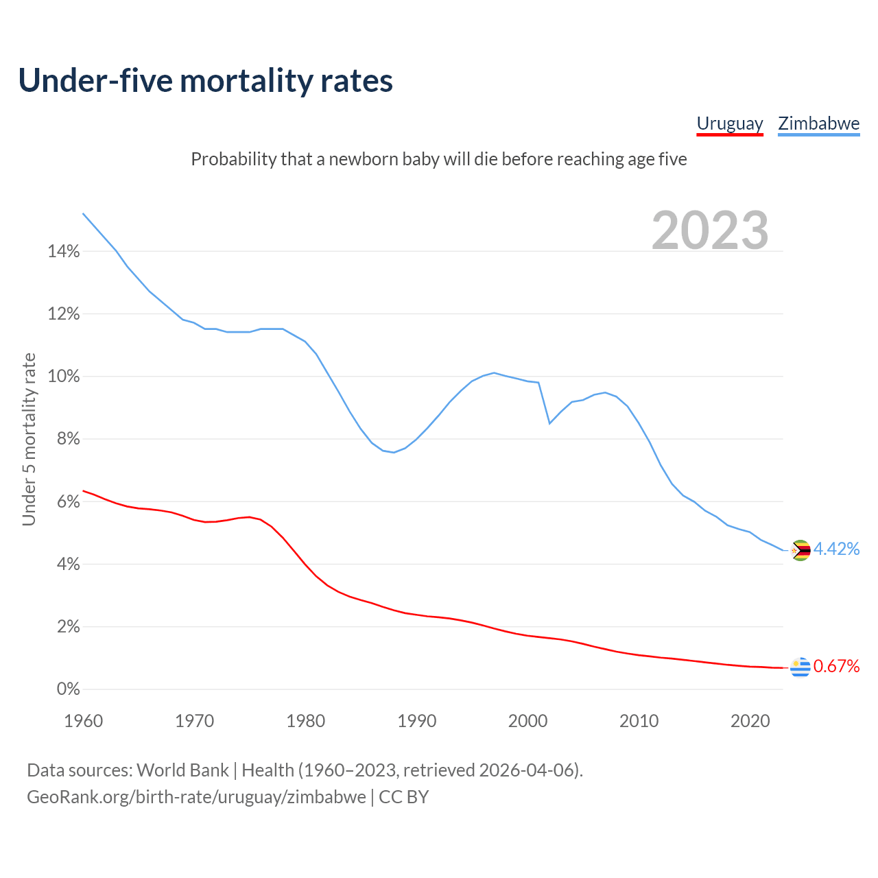 The chance that a newborn baby will die before reaching age five is 0.67% in Uruguay and 4.42% in Zimbabwe. Above is a chart with historical data on under-five mortality rates.