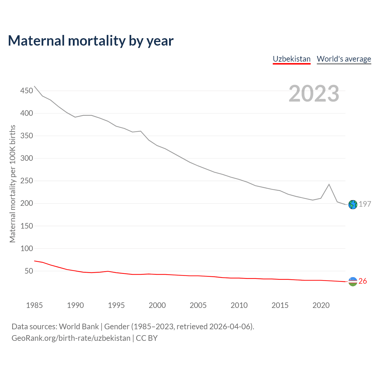 The maternal mortality rate in Uzbekistan was 26 deaths per 100,000 live births in 2023 — a 0.03% chance of dying during childbirth or within 42 days of pregnancy termination. This is a 38.1% decrease compared to the year 2000.