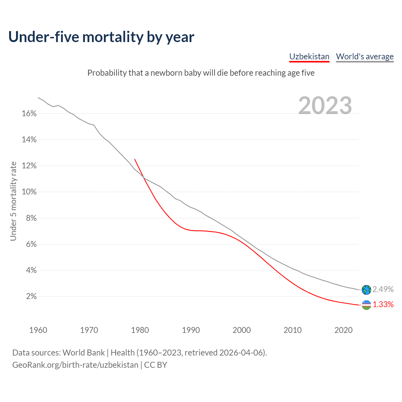 The under-5 mortality rate in Uzbekistan was 13.3 deaths per 1,000 live births in 2023 — a 1.33% chance that a newborn baby will die before reaching age five. This is down from 61.5 deaths per 1,000 live births in 2000.