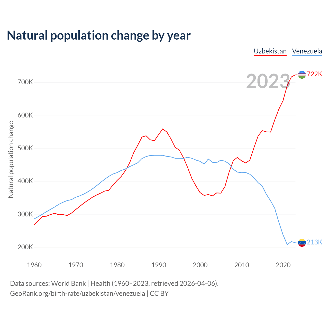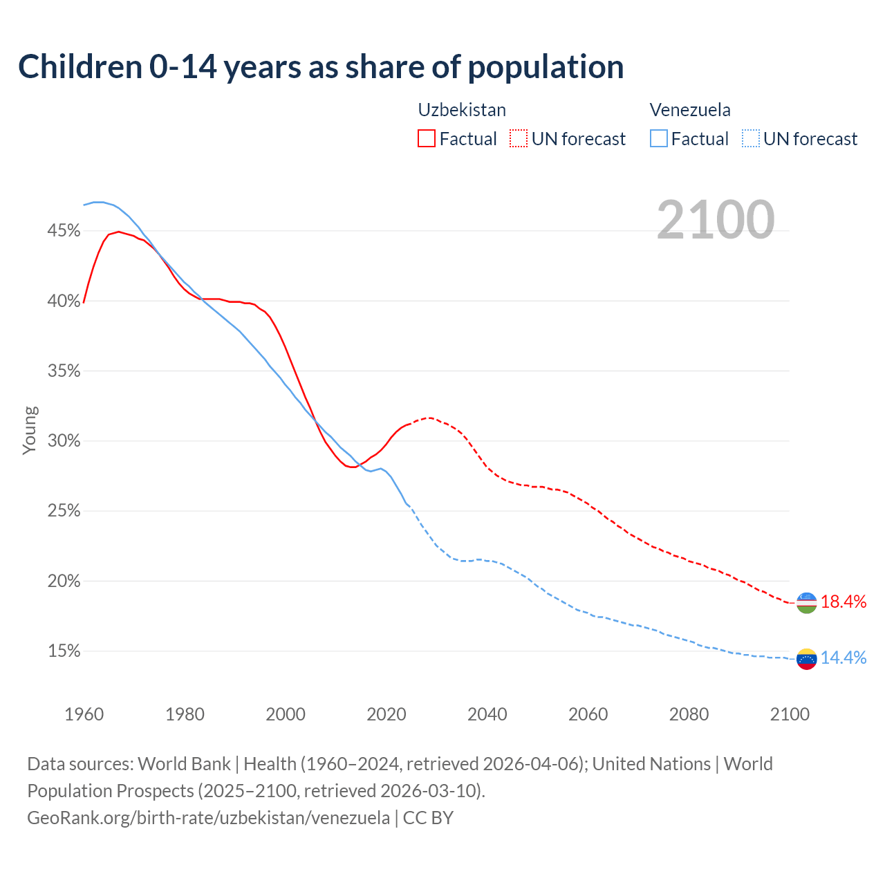 Uzbekistan has an annual birth rate of 26.5 births per 1,000 people, compared to 15.1 for Venezuela. The average number of children a woman is expected to have during her lifetime — the fertility rate, is 3.5 in Uzbekistan and 2.08 in Venezuela — 40.6% difference.