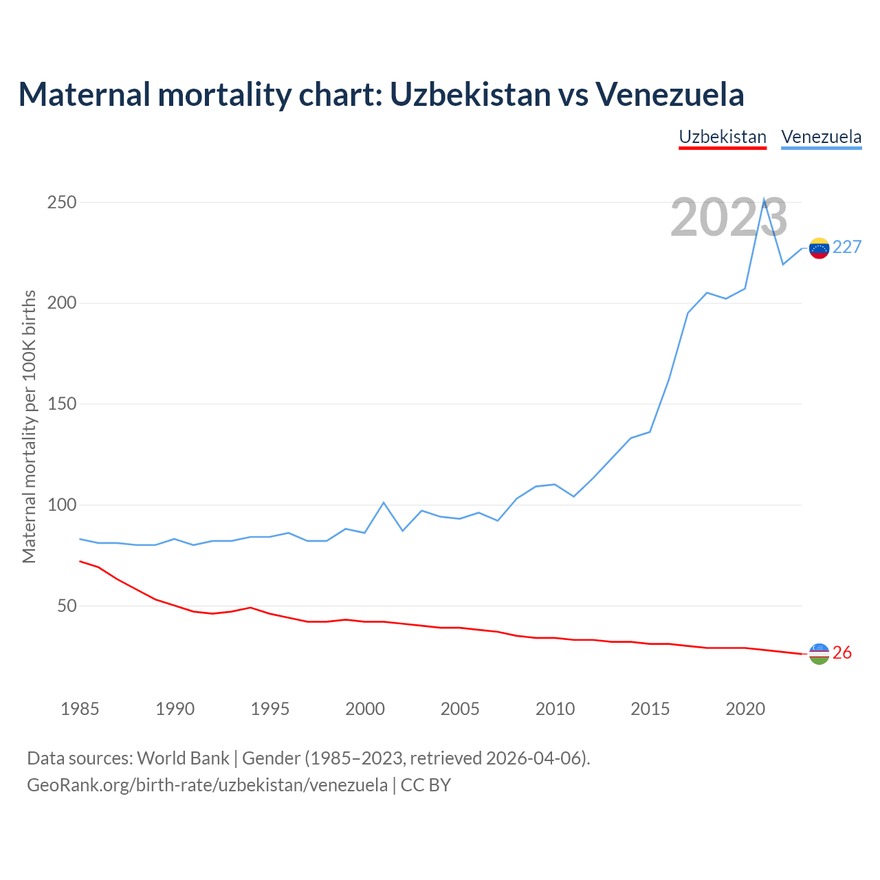 The maternal mortality rate, which is the probability of dying during childbirth or within 42 days of pregnancy termination, is 26 deaths per 100,000 live births in Uzbekistan, compared to 227 deaths in Venezuela.