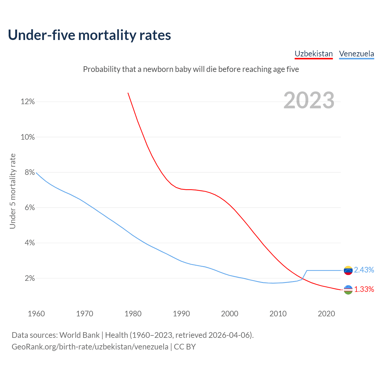 The chance that a newborn baby will die before reaching age five is 1.33% in Uzbekistan and 2.43% in Venezuela. Above is a chart with historical data on under-five mortality rates.