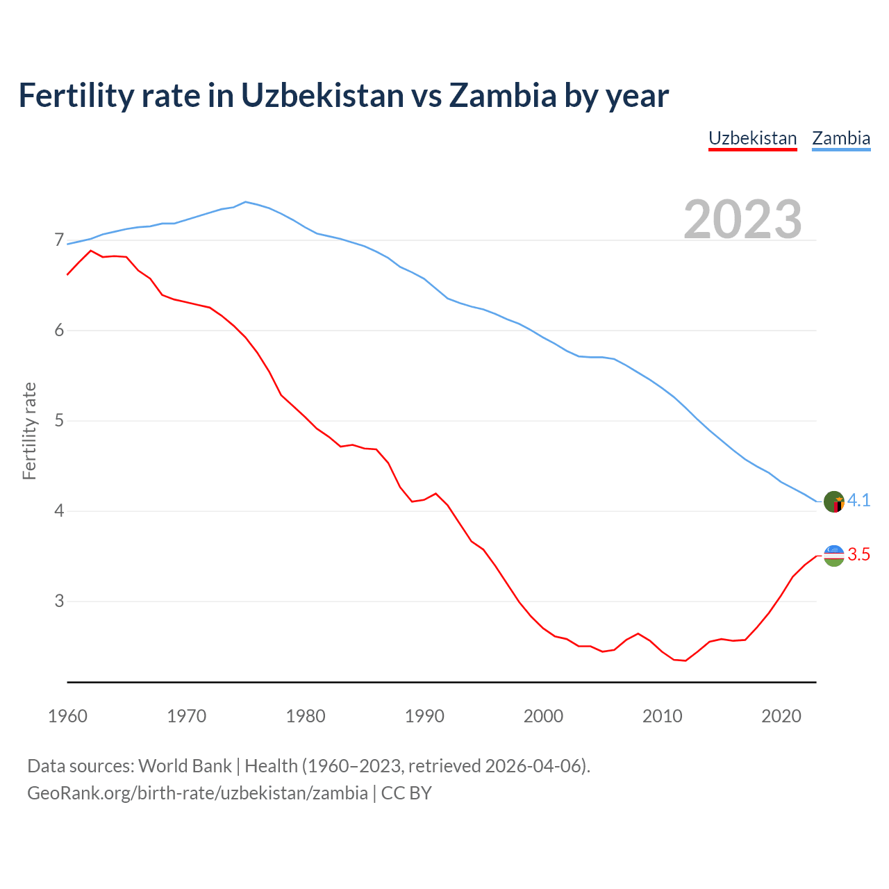 1960 vs 2023, the fertility rate has decreased by 47.1% in Uzbekistan and by 41% in Zambia — in 1960, it was 6.61 and 6.95, respectively.