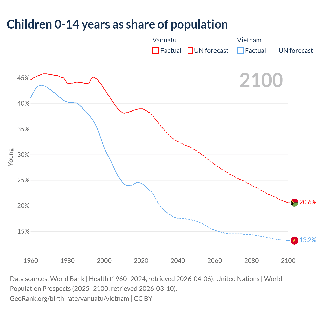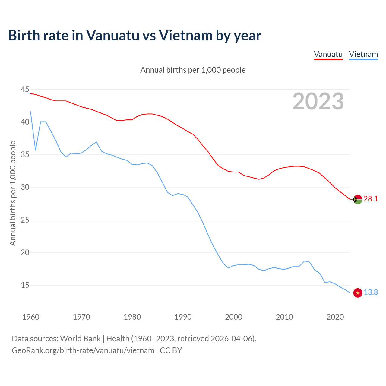 Vanuatu has an annual birth rate of 28.1 births per 1,000 people, compared to 13.8 for Vietnam. The average number of children a woman is expected to have during her lifetime — the fertility rate, is 3.6 in Vanuatu and 1.91 in Vietnam — 46.8% difference.