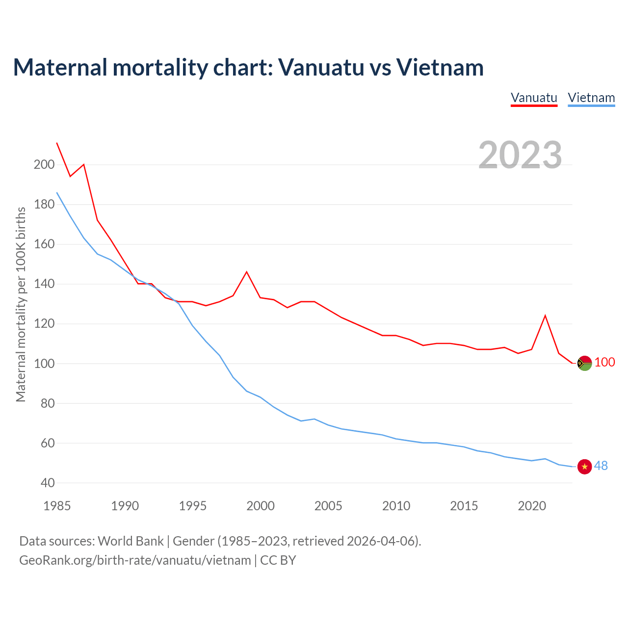 The maternal mortality rate, which is the probability of dying during childbirth or within 42 days of pregnancy termination, is 100 deaths per 100,000 live births in Vanuatu, compared to 48 deaths in Vietnam.