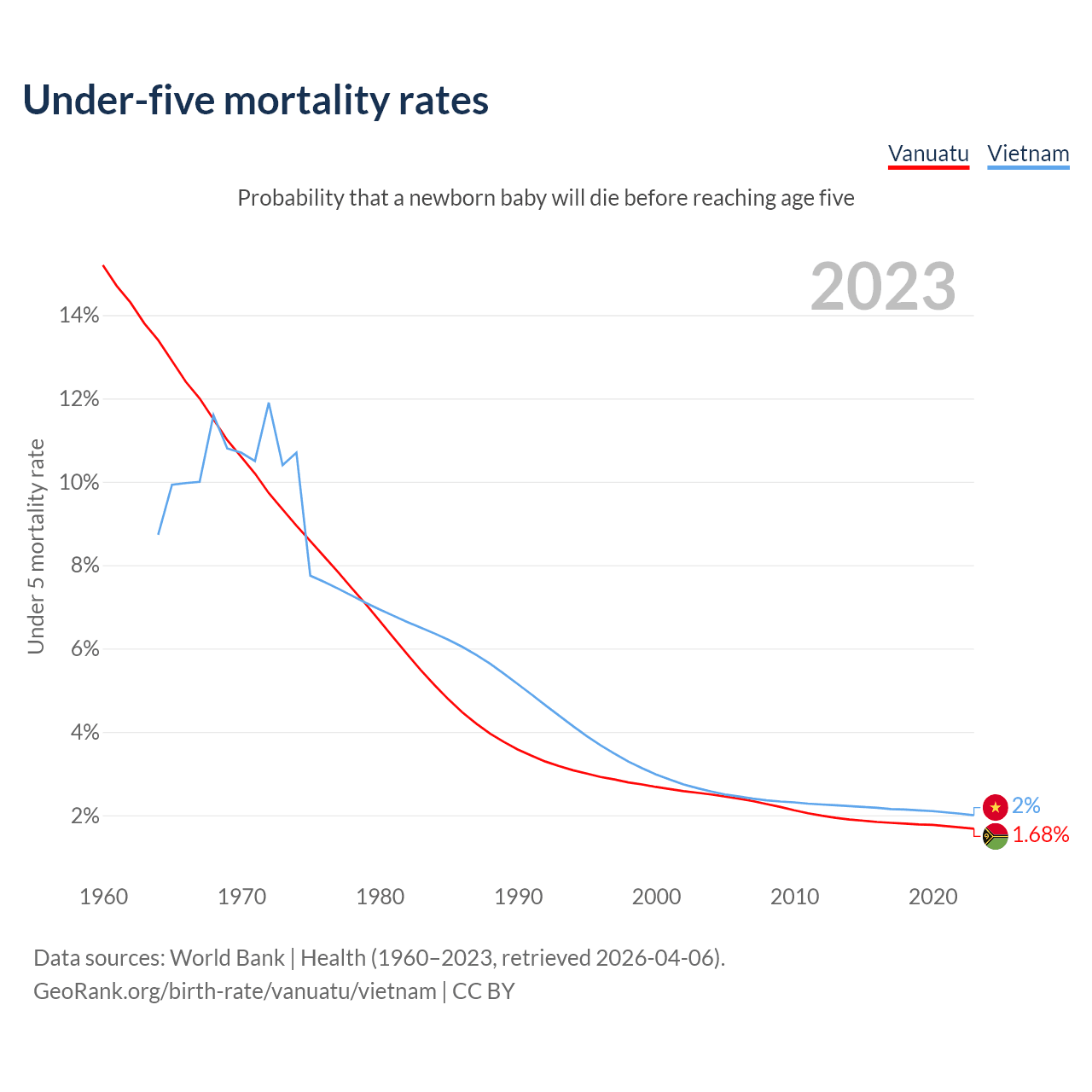 The chance that a newborn baby will die before reaching age five is 1.68% in Vanuatu and 2% in Vietnam. Above is a chart with historical data on under-five mortality rates.