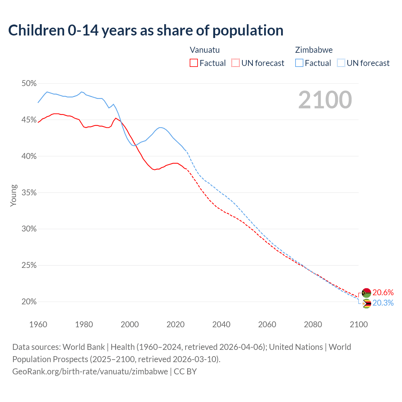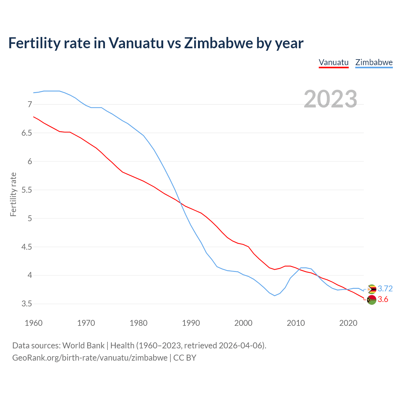 According to the latest available data on birth rates, the fertility rate in Vanuatu was 3.6 children per woman in 2023, compared to 3.72 in Zimbabwe in 2023. The replacement level is considered to be 2.1 children per woman.