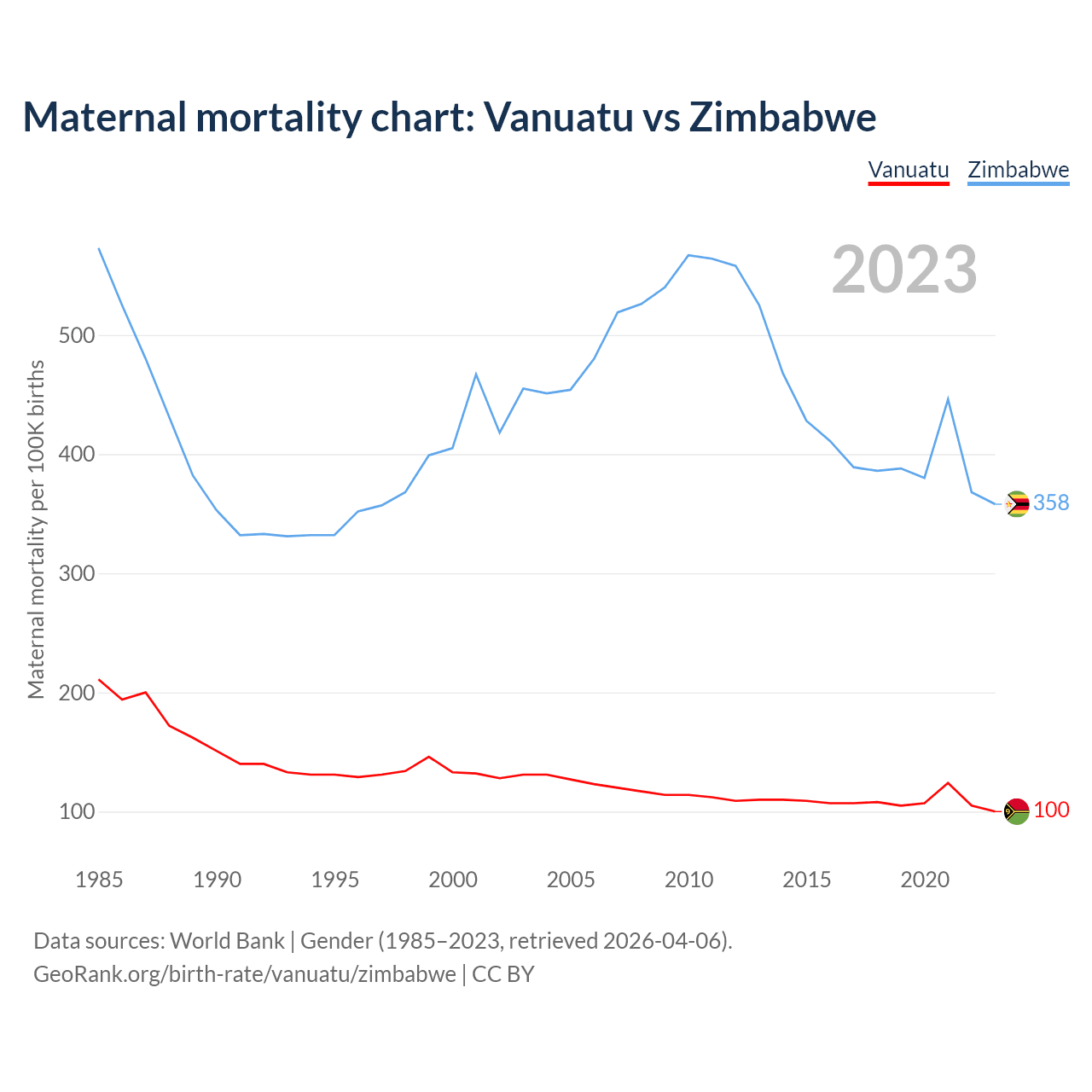 The maternal mortality rate, which is the probability of dying during childbirth or within 42 days of pregnancy termination, is 100 deaths per 100,000 live births in Vanuatu, compared to 358 deaths in Zimbabwe.