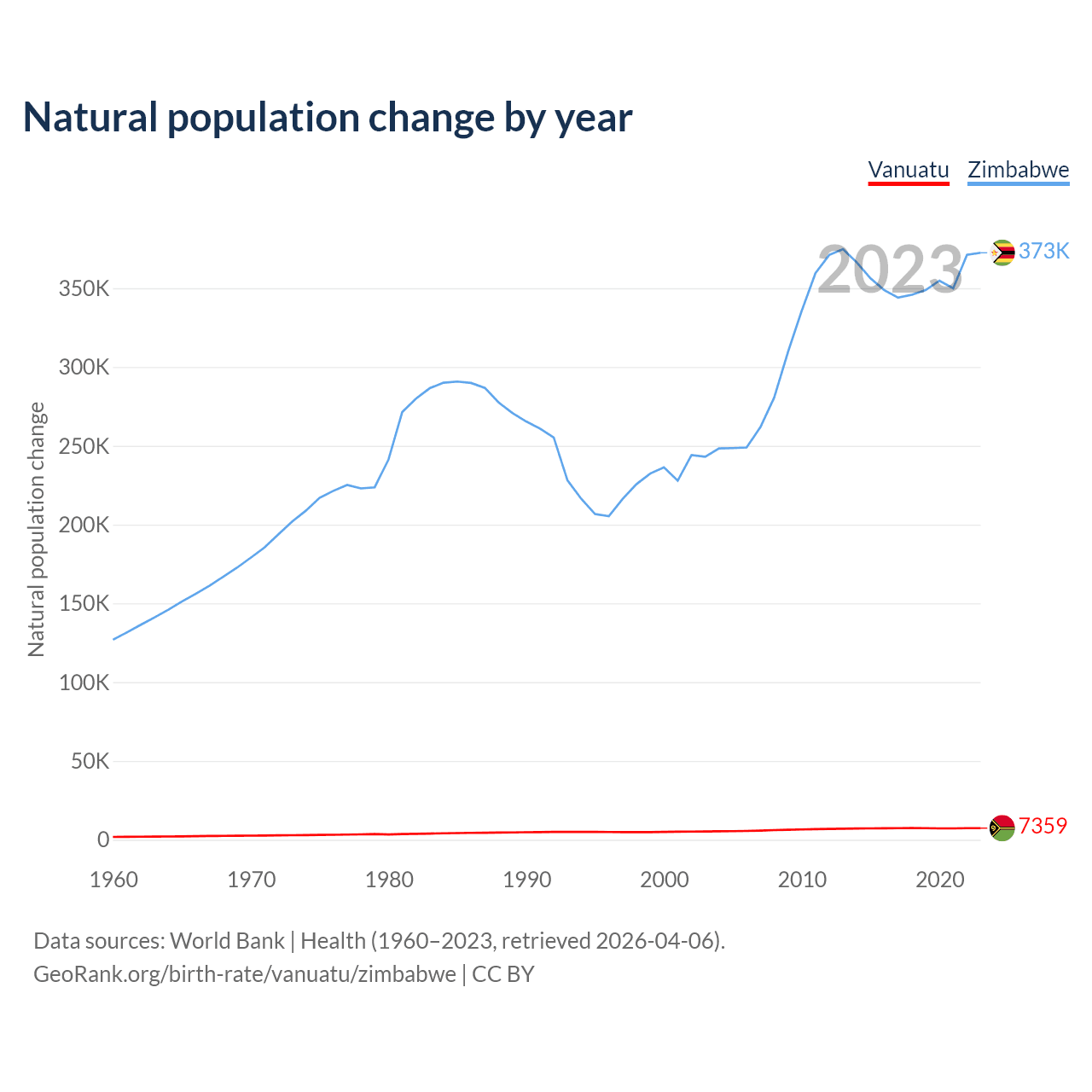 Vanuatu has an annual birth rate of 28.1 births per 1,000 people, compared to 30.4 for Zimbabwe. The average number of children a woman is expected to have during her lifetime — the fertility rate, is 3.6 in Vanuatu and 3.72 in Zimbabwe — 3.56% difference.