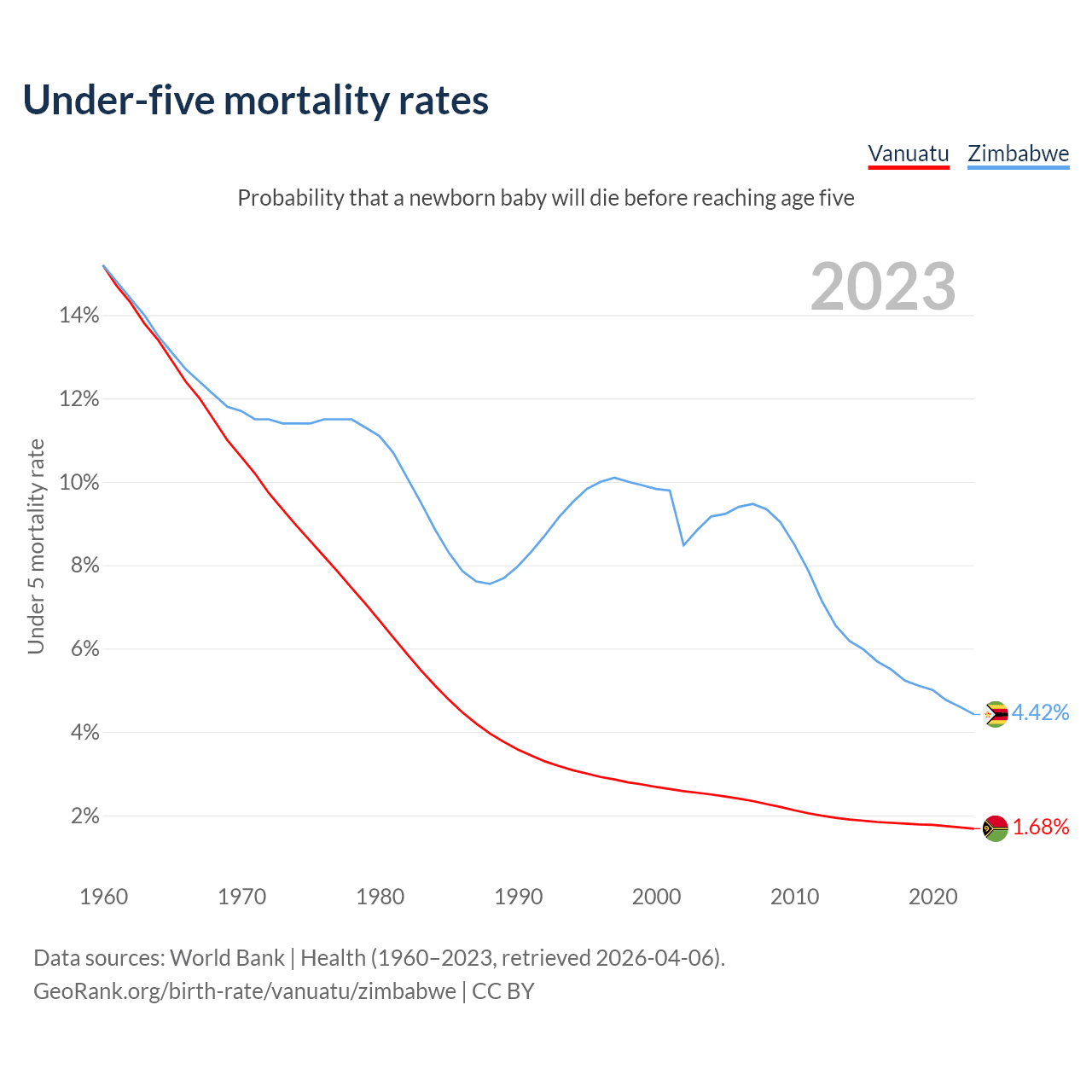The chance that a newborn baby will die before reaching age five is 1.68% in Vanuatu and 4.42% in Zimbabwe. Above is a chart with historical data on under-five mortality rates.