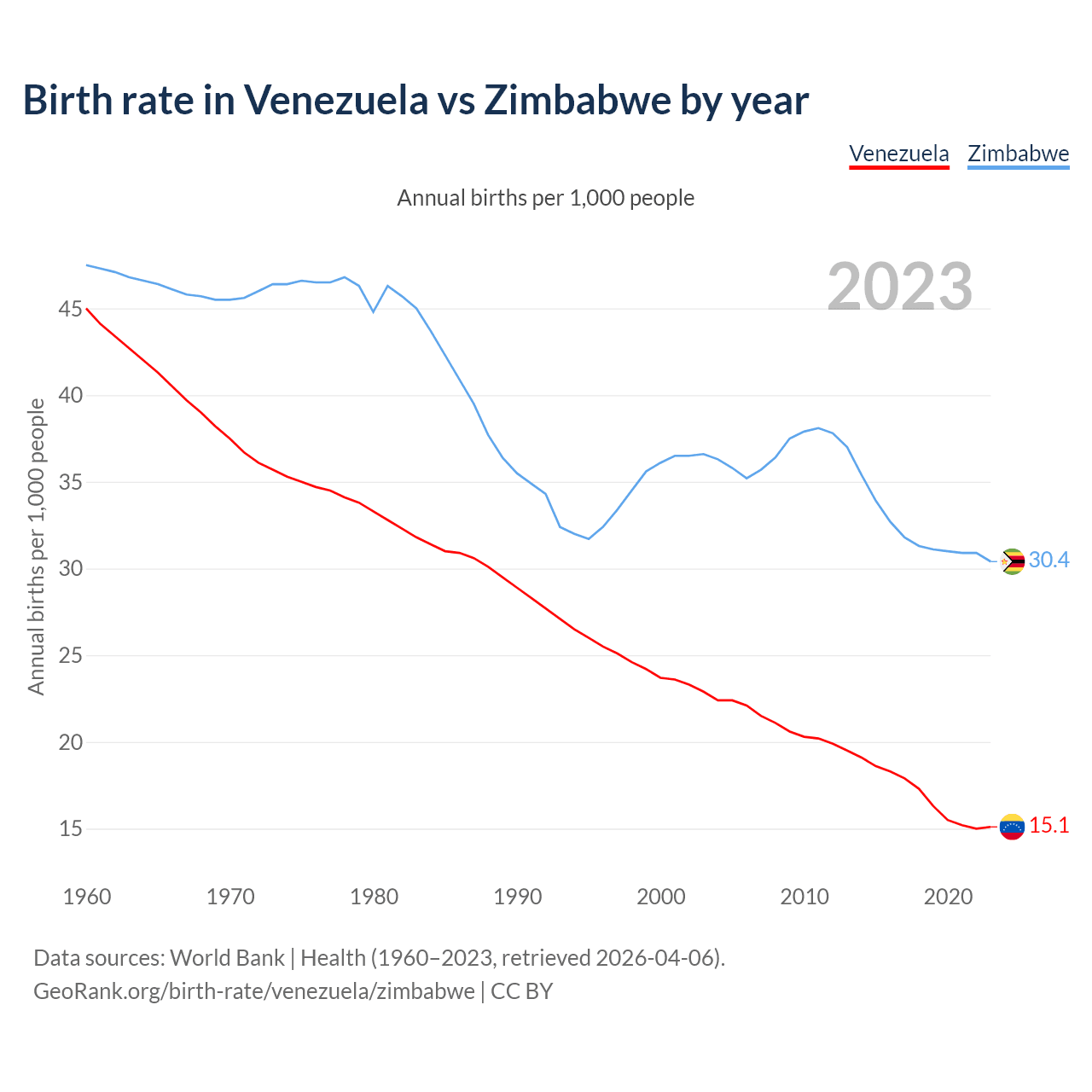 Venezuela has an annual birth rate of 15.1 births per 1,000 people, compared to 30.4 for Zimbabwe. The average number of children a woman is expected to have during her lifetime — the fertility rate, is 2.08 in Venezuela and 3.72 in Zimbabwe — 79.1% difference.