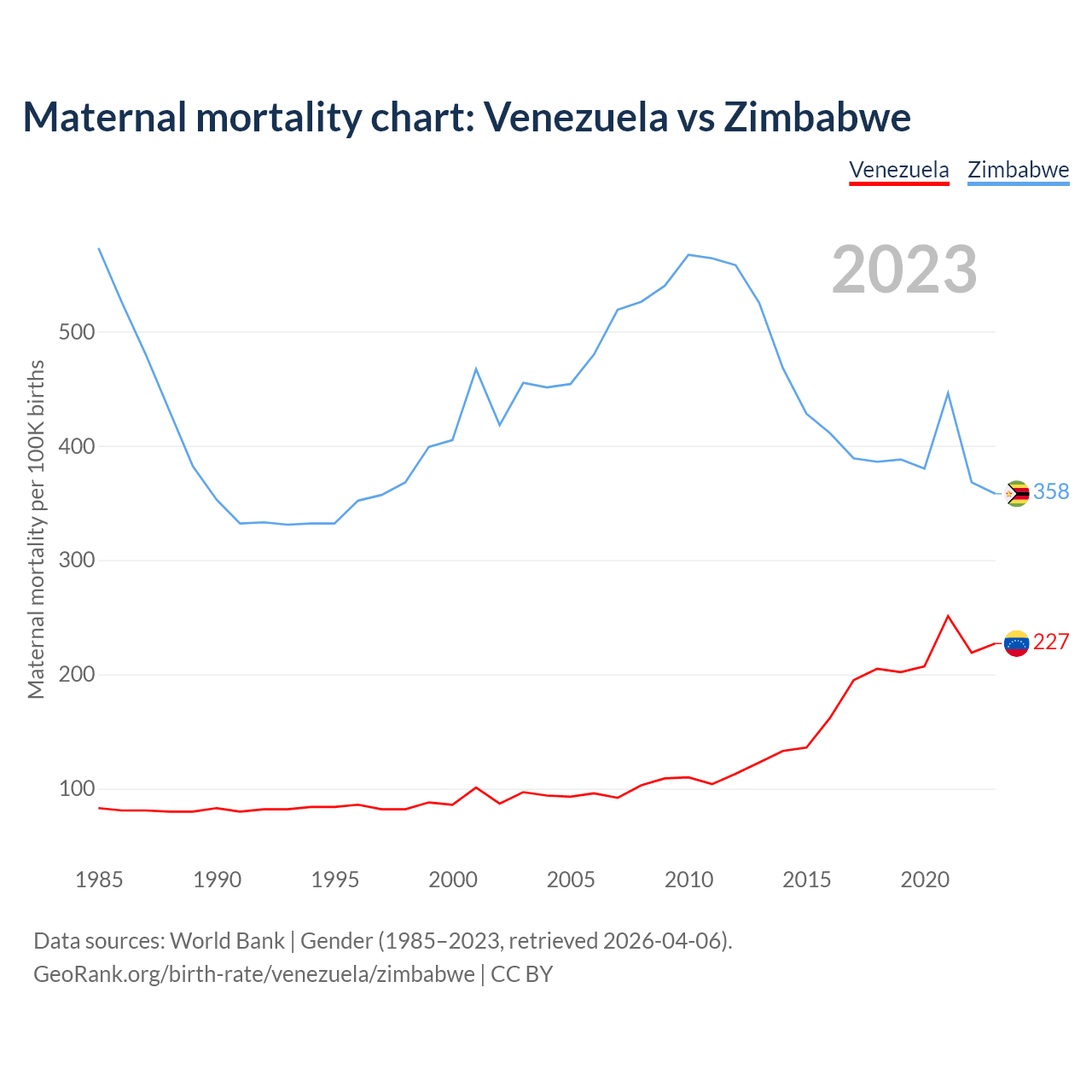 The maternal mortality rate, which is the probability of dying during childbirth or within 42 days of pregnancy termination, is 227 deaths per 100,000 live births in Venezuela, compared to 358 deaths in Zimbabwe.