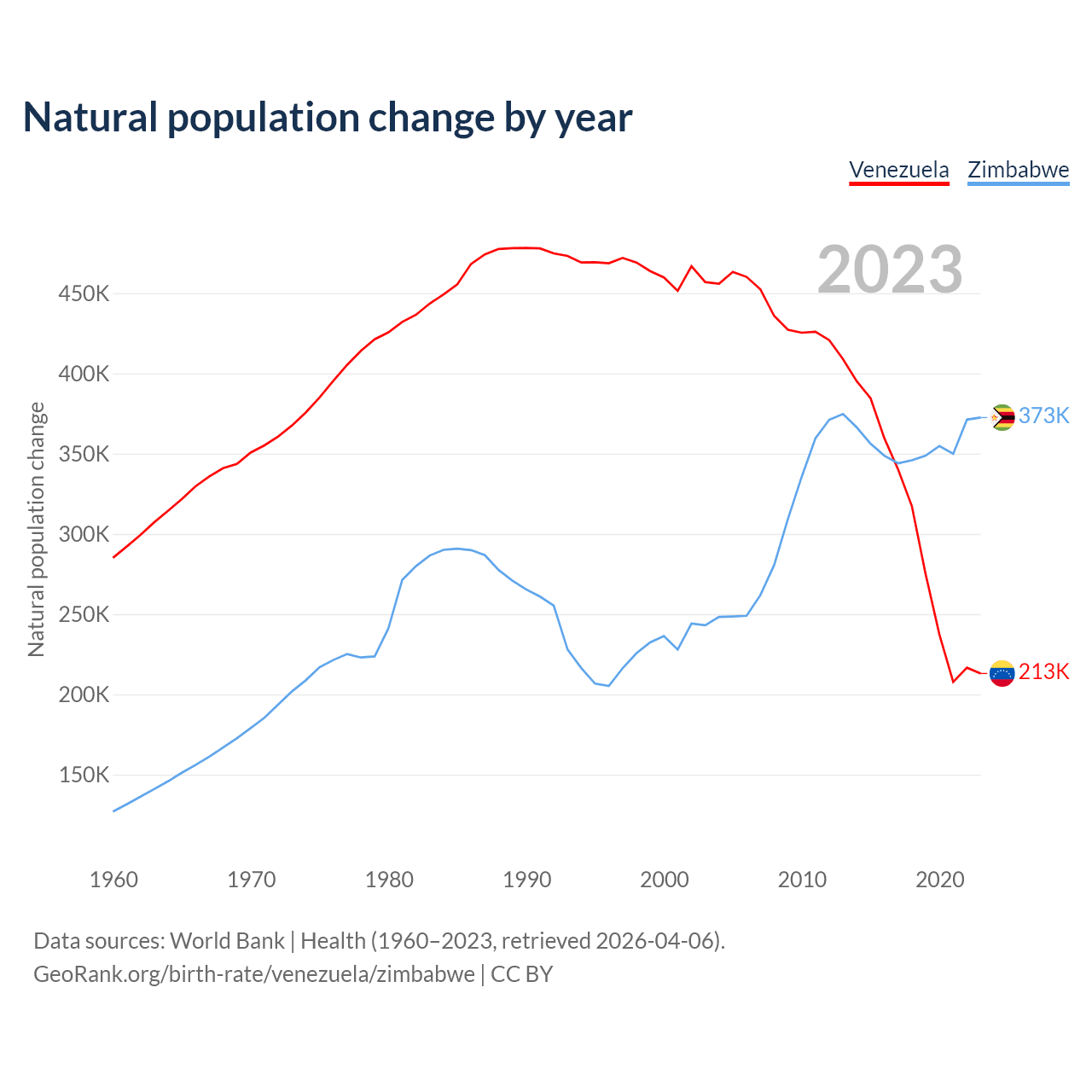 According to the latest available data on birth rates, the fertility rate in Venezuela was 2.08 children per woman in 2023, compared to 3.72 in Zimbabwe in 2023. The replacement level is considered to be 2.1 children per woman.