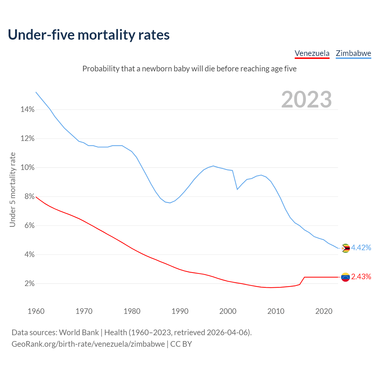 The chance that a newborn baby will die before reaching age five is 2.43% in Venezuela and 4.42% in Zimbabwe. Above is a chart with historical data on under-five mortality rates.