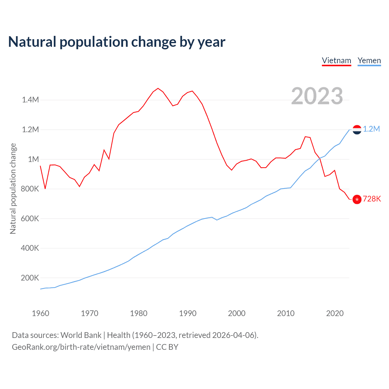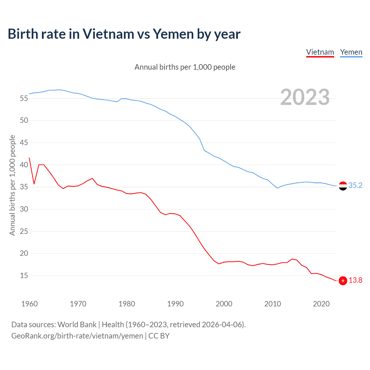Vietnam has an annual birth rate of 13.8 births per 1,000 people, compared to 35.2 for Yemen. The average number of children a woman is expected to have during her lifetime — the fertility rate, is 1.91 in Vietnam and 4.59 in Yemen — 139.9% difference.