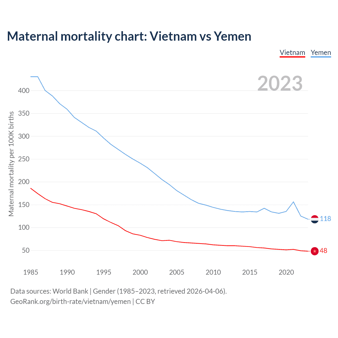 The maternal mortality rate, which is the probability of dying during childbirth or within 42 days of pregnancy termination, is 48 deaths per 100,000 live births in Vietnam, compared to 118 deaths in Yemen.