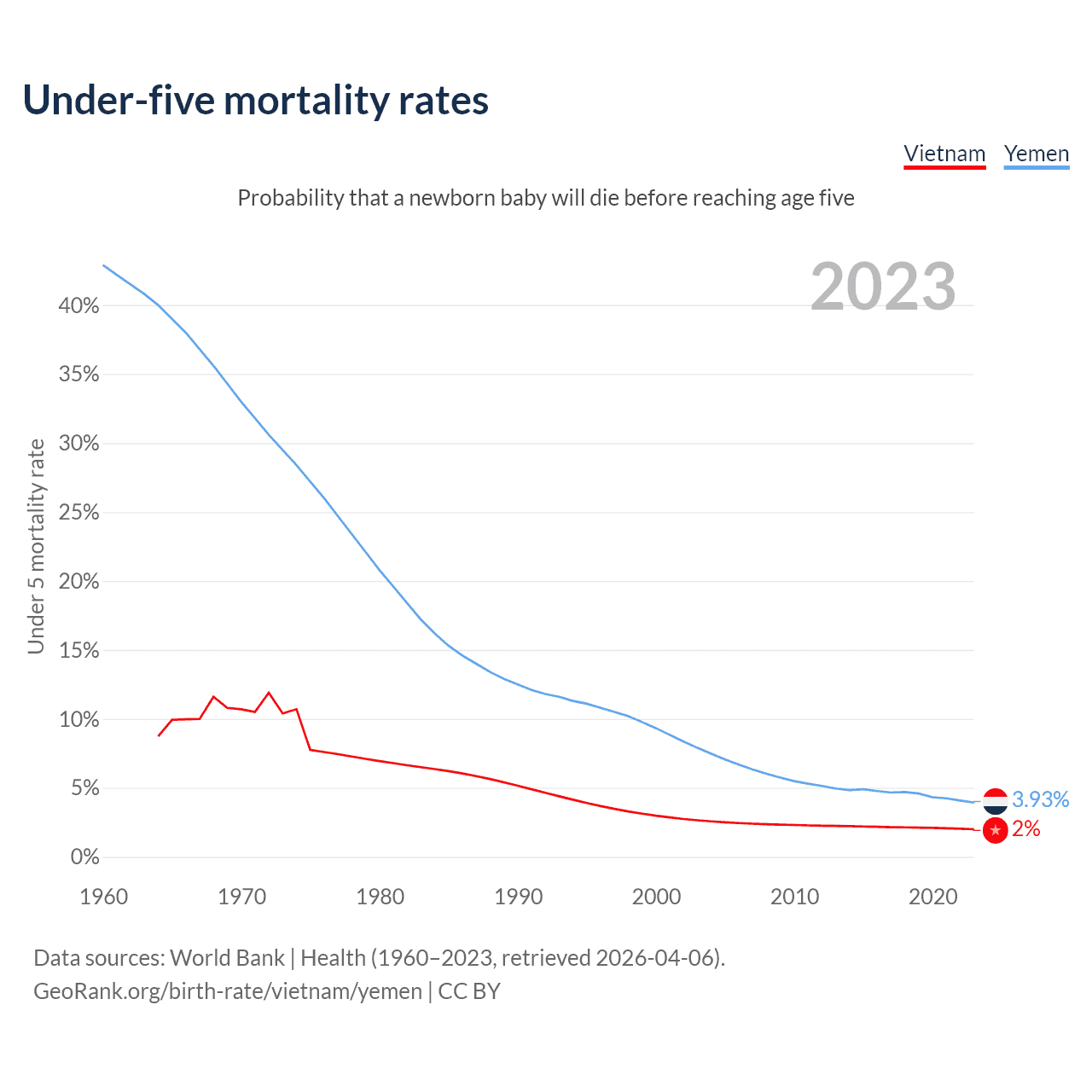 The chance that a newborn baby will die before reaching age five is 2% in Vietnam and 3.93% in Yemen. Above is a chart with historical data on under-five mortality rates.