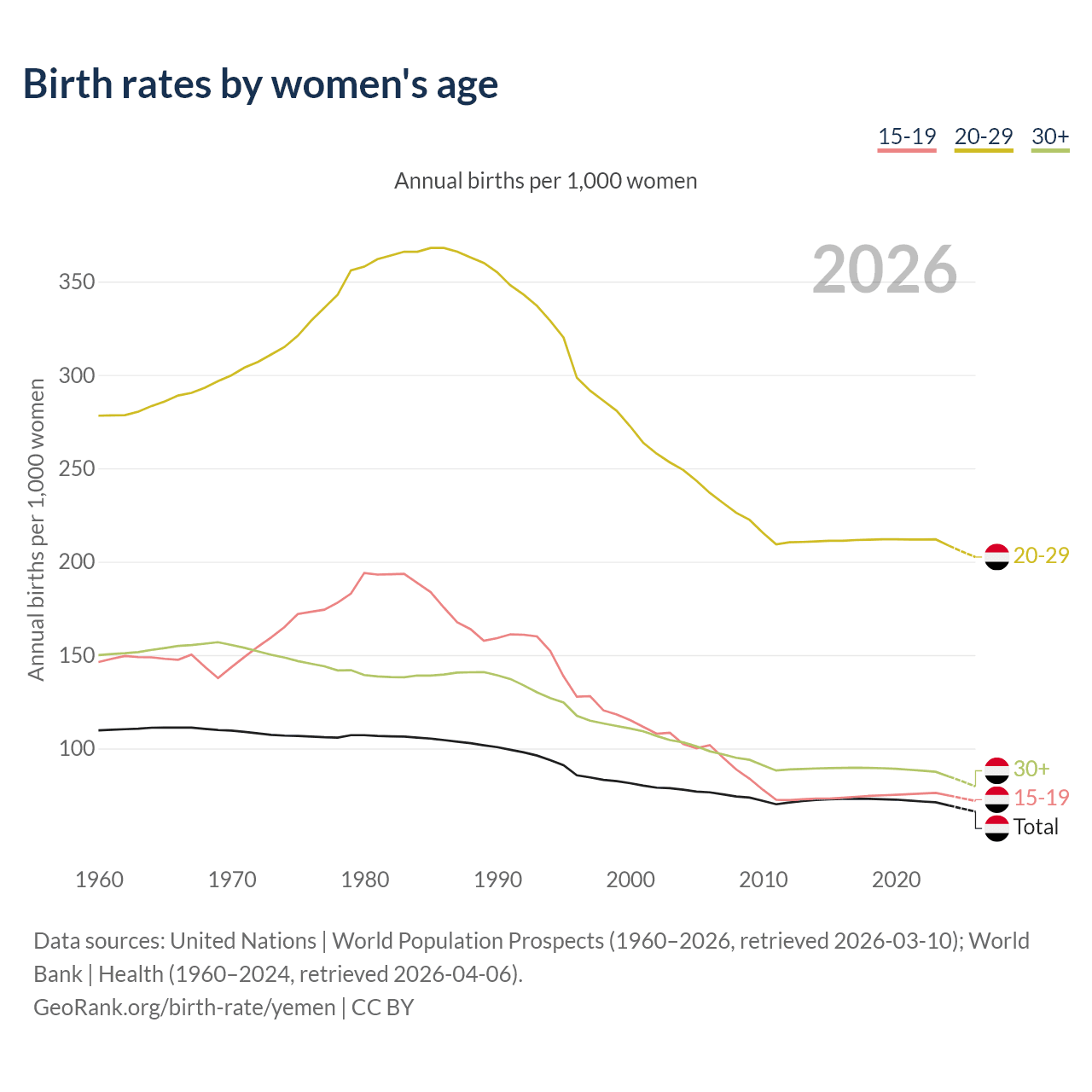 Yemen has a birth rate of 35.2 (annual births per 1,000 people) and a fertility rate of 4.59 (the average number of children a woman is expected to have over her lifetime based on current age-specific birth rates).