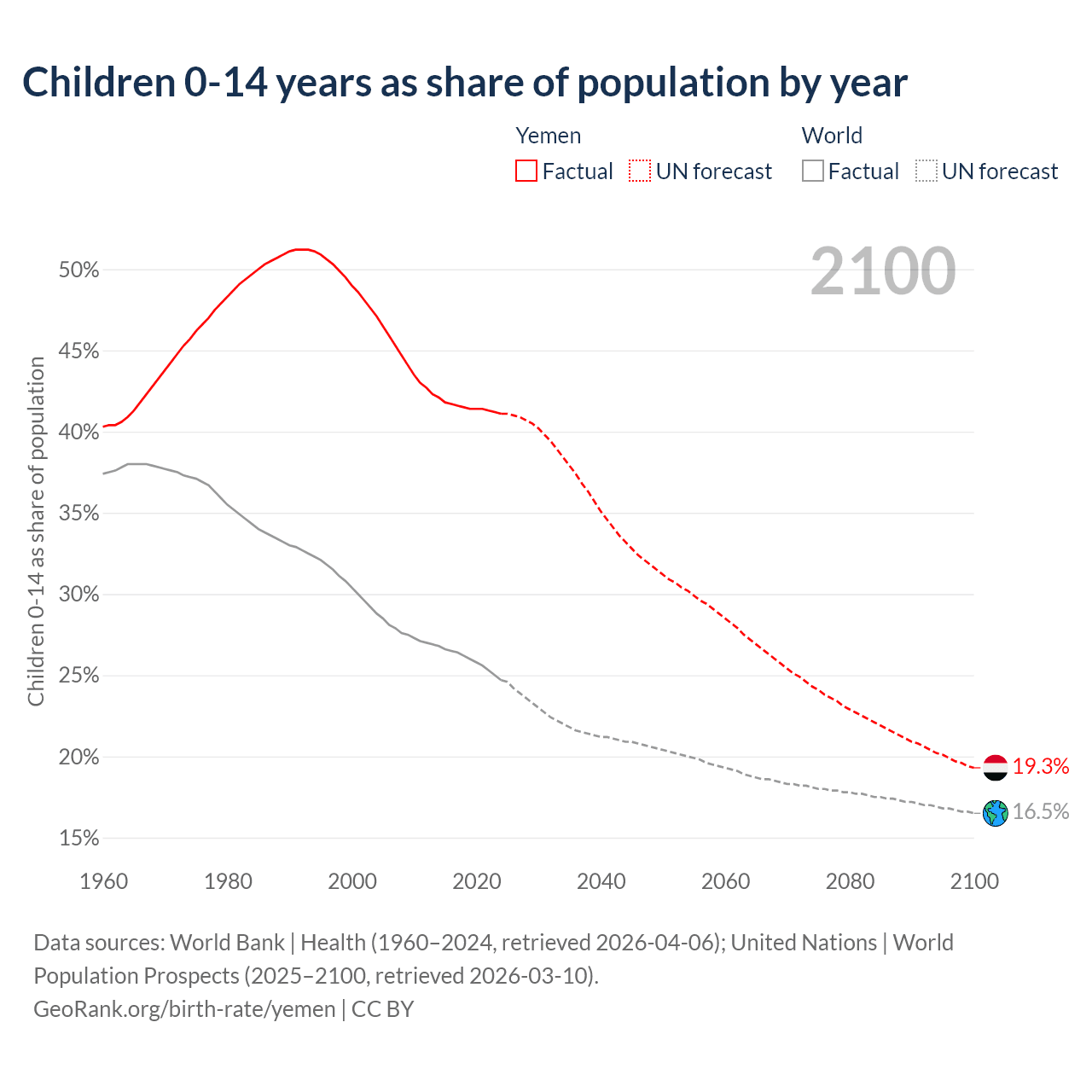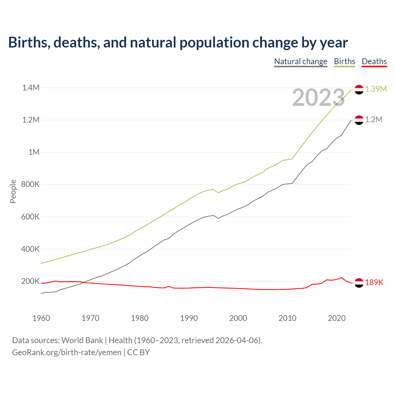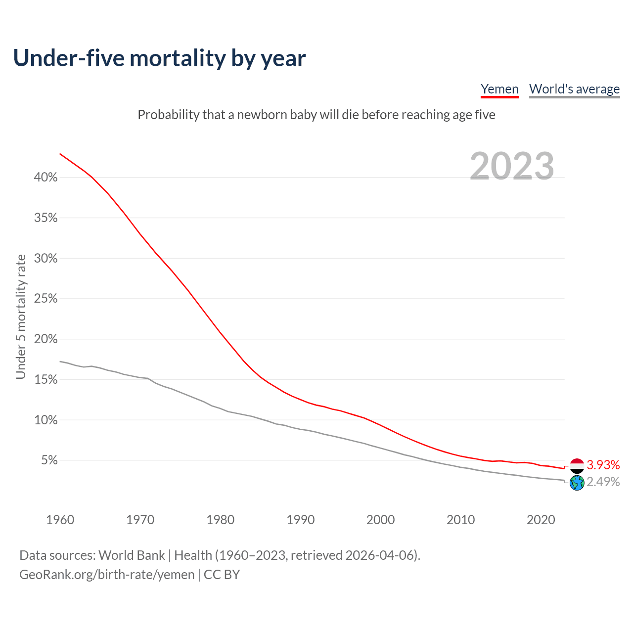 The under-5 mortality rate in Yemen was 39.3 deaths per 1,000 live births in 2023 — a 3.93% chance that a newborn baby will die before reaching age five. This is down from 93.2 deaths per 1,000 live births in 2000.