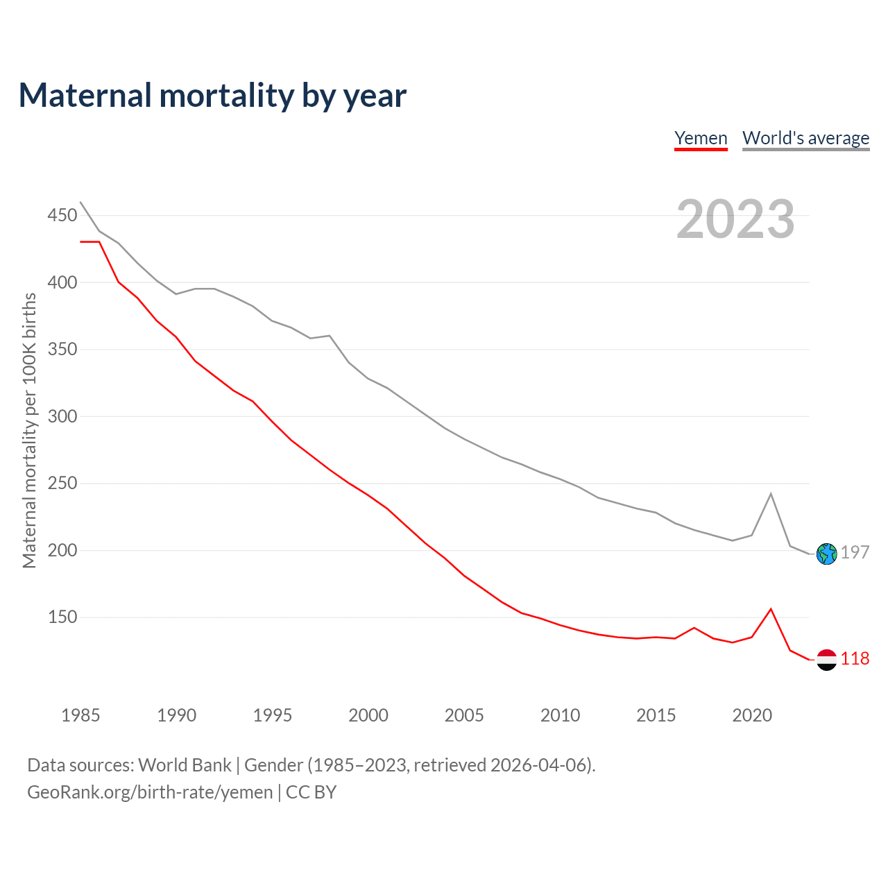 The maternal mortality rate in Yemen was 118 deaths per 100,000 live births in 2023 — a 0.12% chance of dying during childbirth or within 42 days of pregnancy termination. This is a 51% decrease compared to the year 2000.