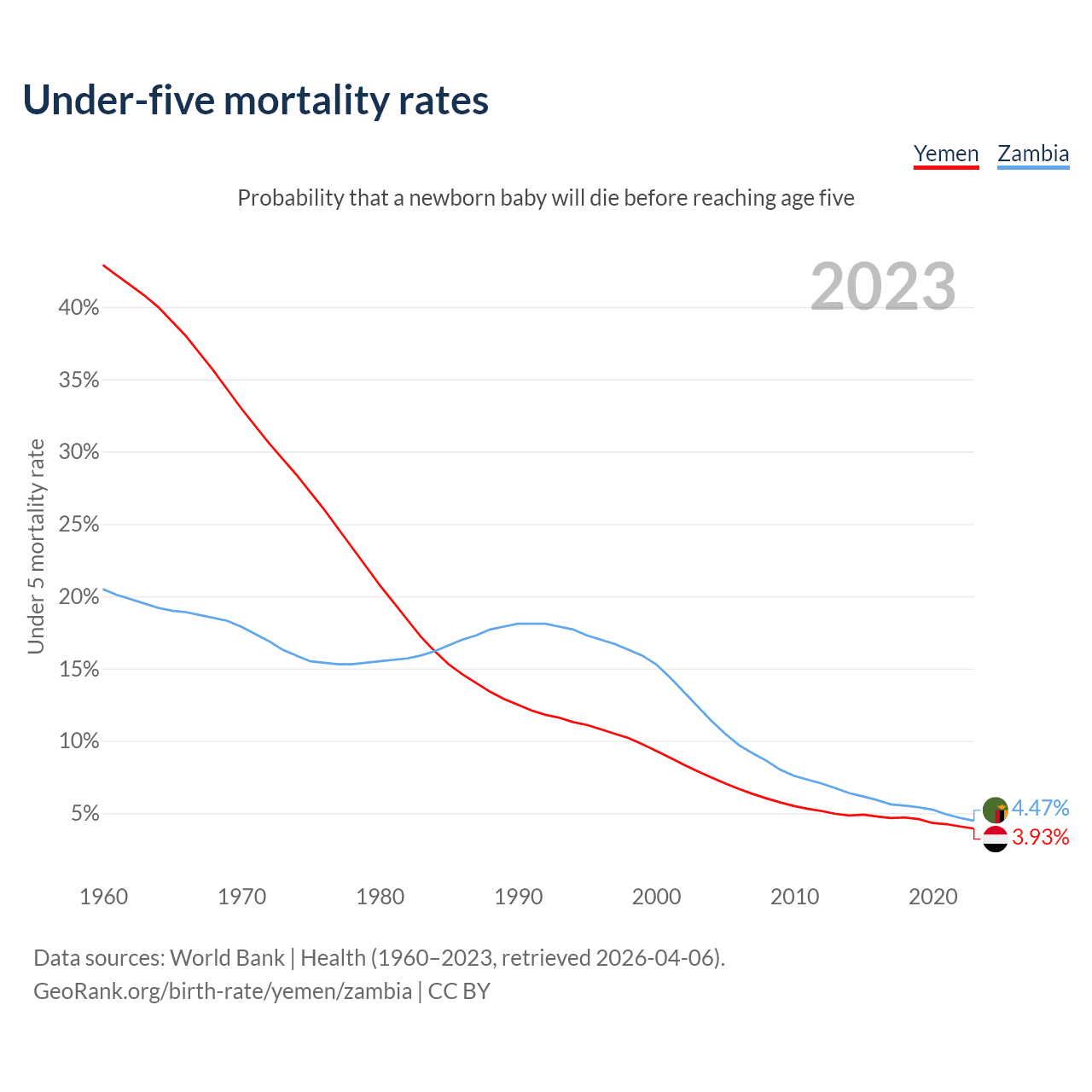 The chance that a newborn baby will die before reaching age five is 3.93% in Yemen and 4.47% in Zambia. Above is a chart with historical data on under-five mortality rates.