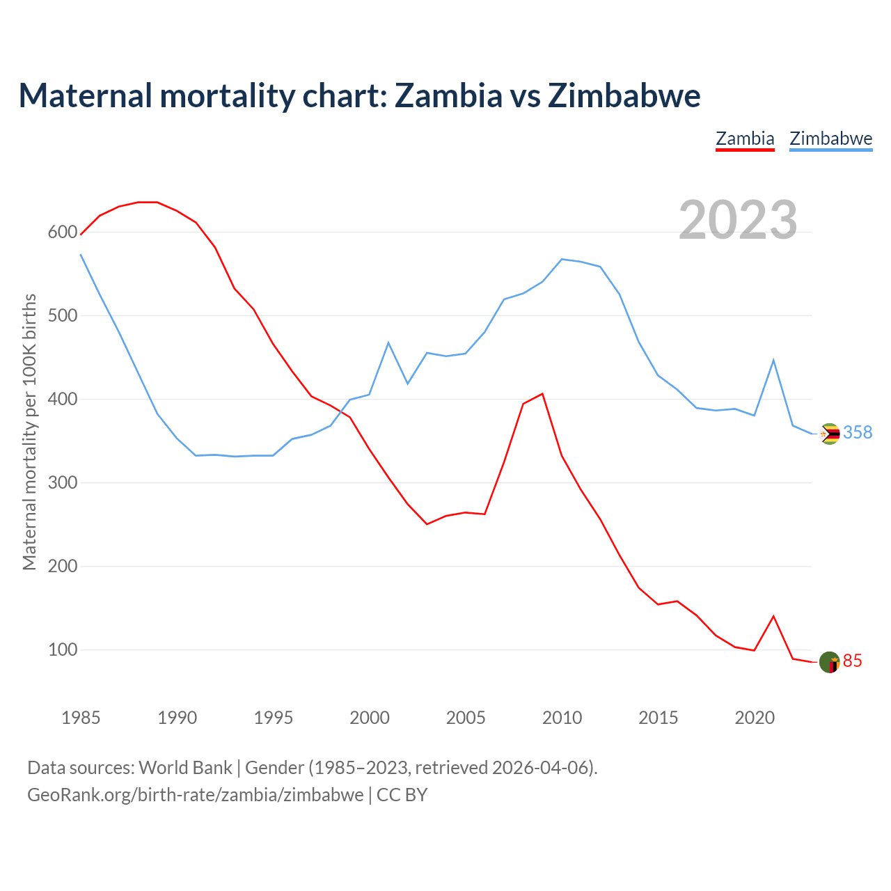 The maternal mortality rate, which is the probability of dying during childbirth or within 42 days of pregnancy termination, is 85 deaths per 100,000 live births in Zambia, compared to 358 deaths in Zimbabwe.