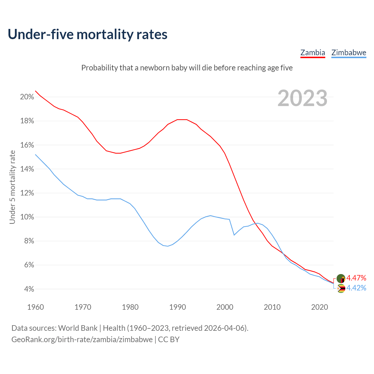 The chance that a newborn baby will die before reaching age five is 4.47% in Zambia and 4.42% in Zimbabwe. Above is a chart with historical data on under-five mortality rates.