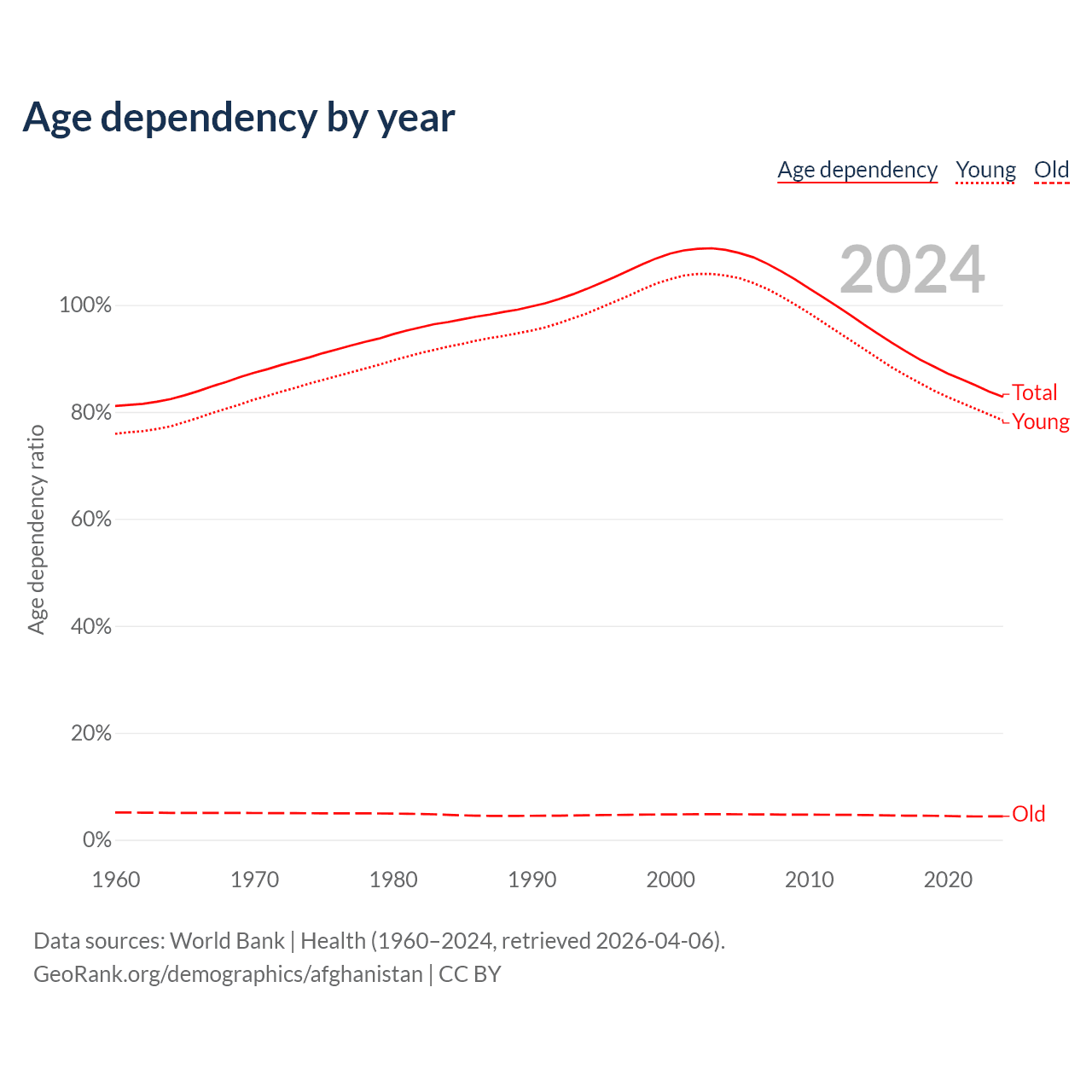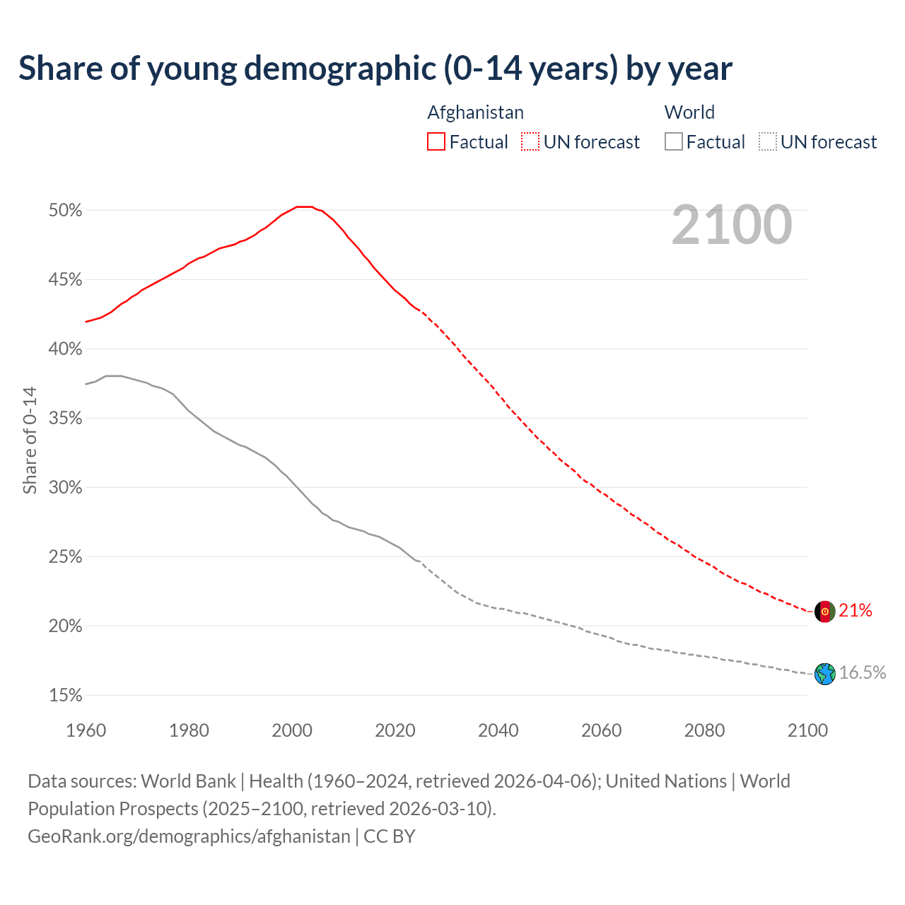 The share of children aged 0-14 in Afghanistan decreased from 50.2% to 42.9% between 2004 and 2024 due to changes in birth rates.