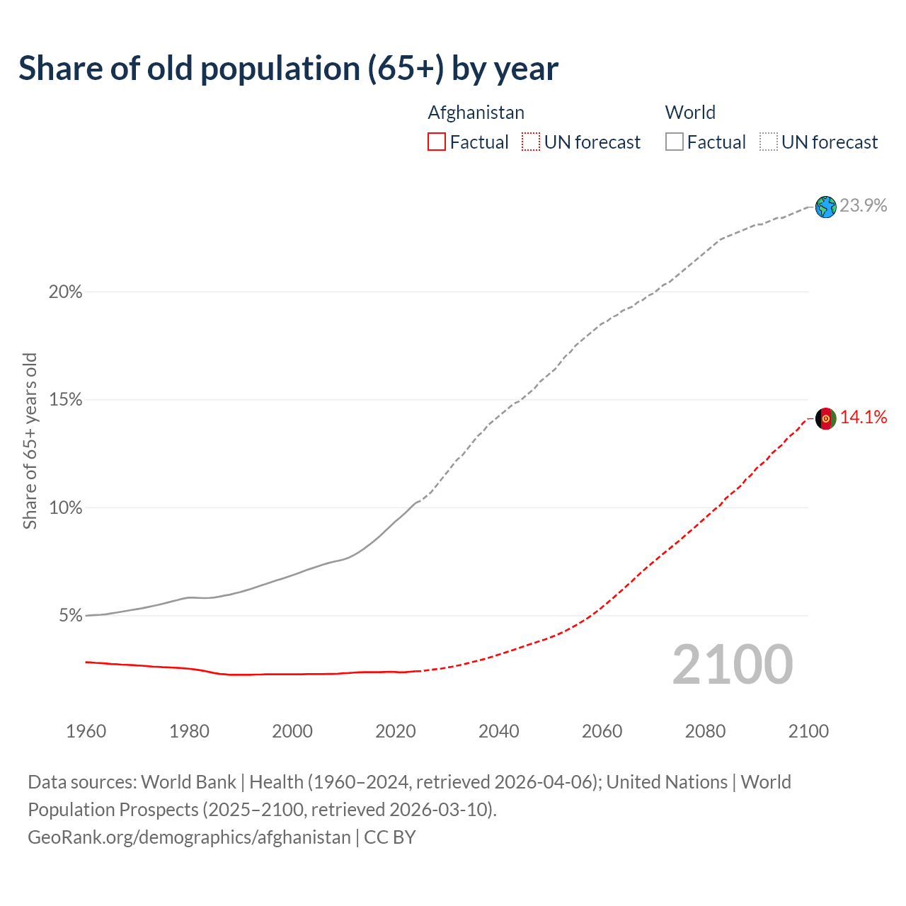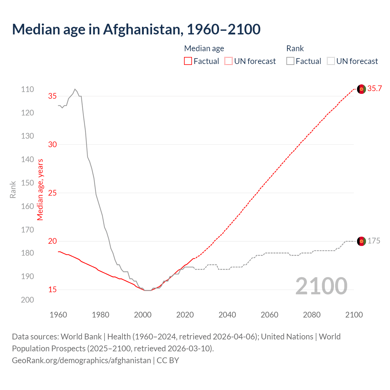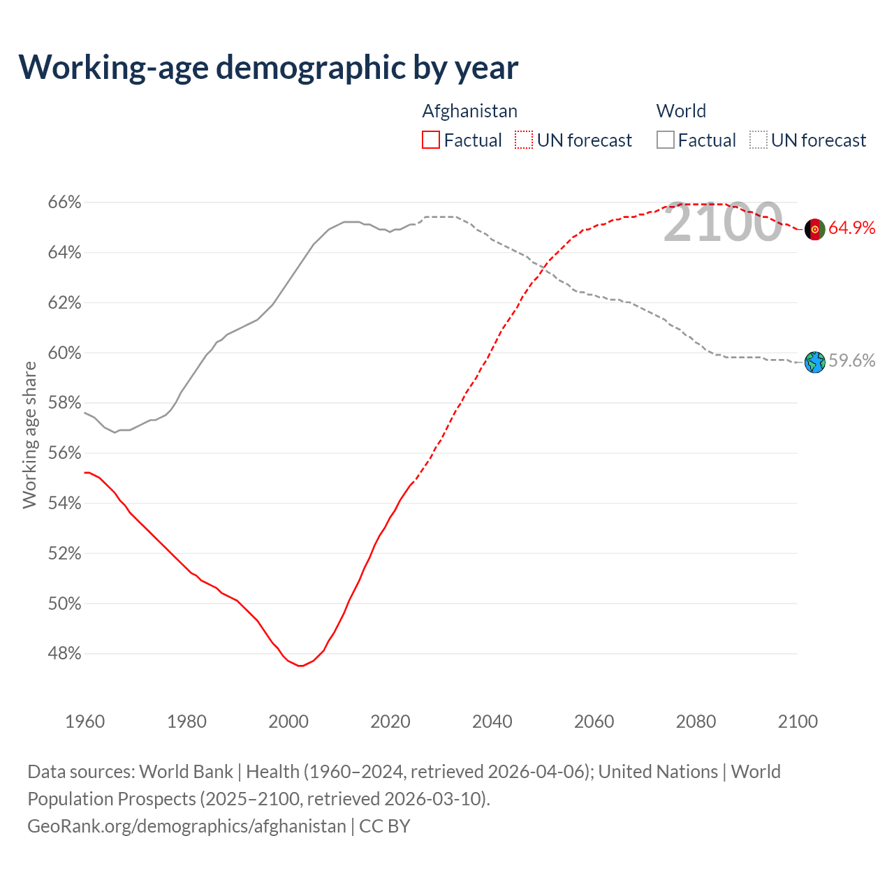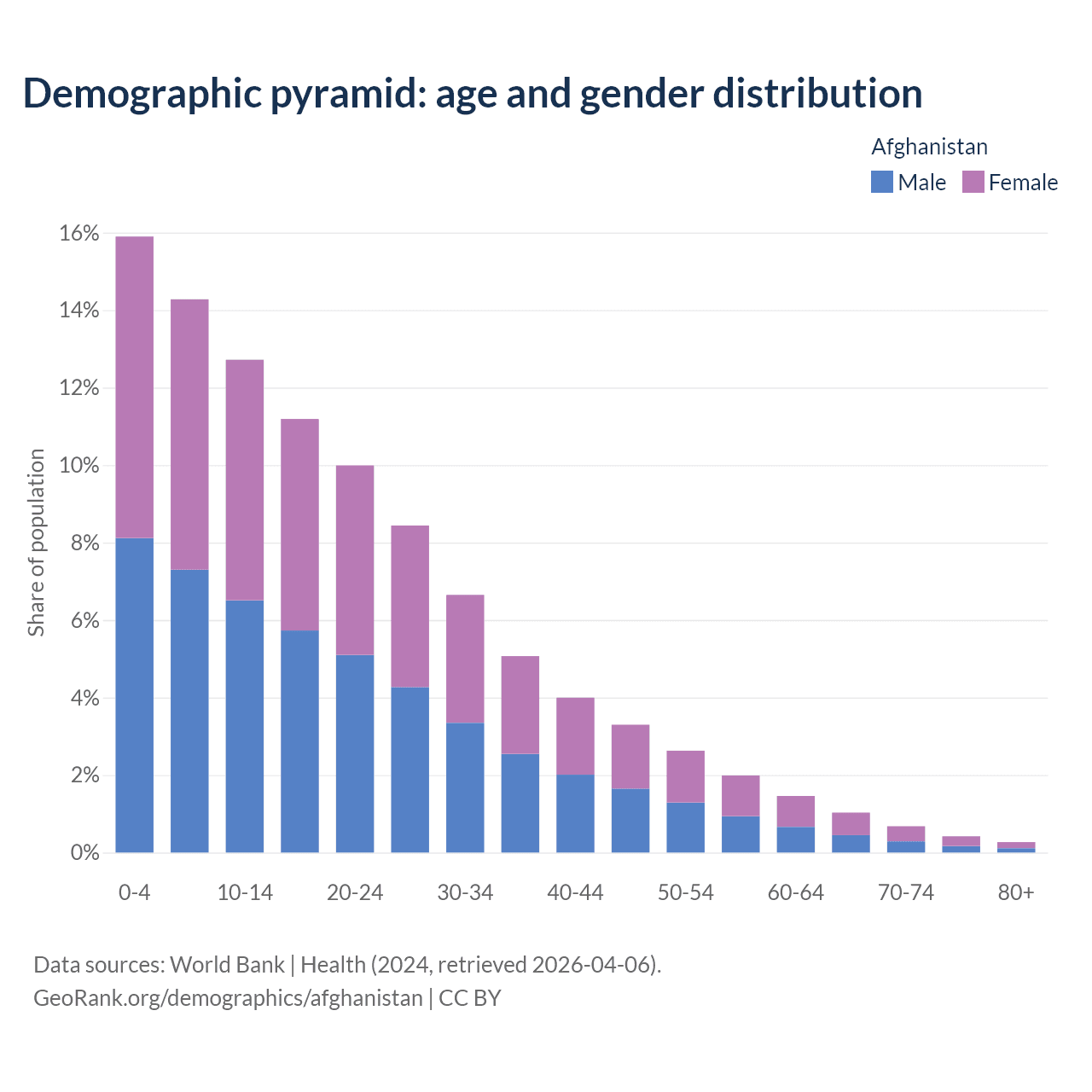 With a population of 42.6M people, Afghanistan has a median age of 18.2 years which makes it the 186/196 oldest country. 42.9% of the demographic are children 0-14 years old, 54.7% are working-age people aged 15-64, and 2.4% are older population aged 65+ years.