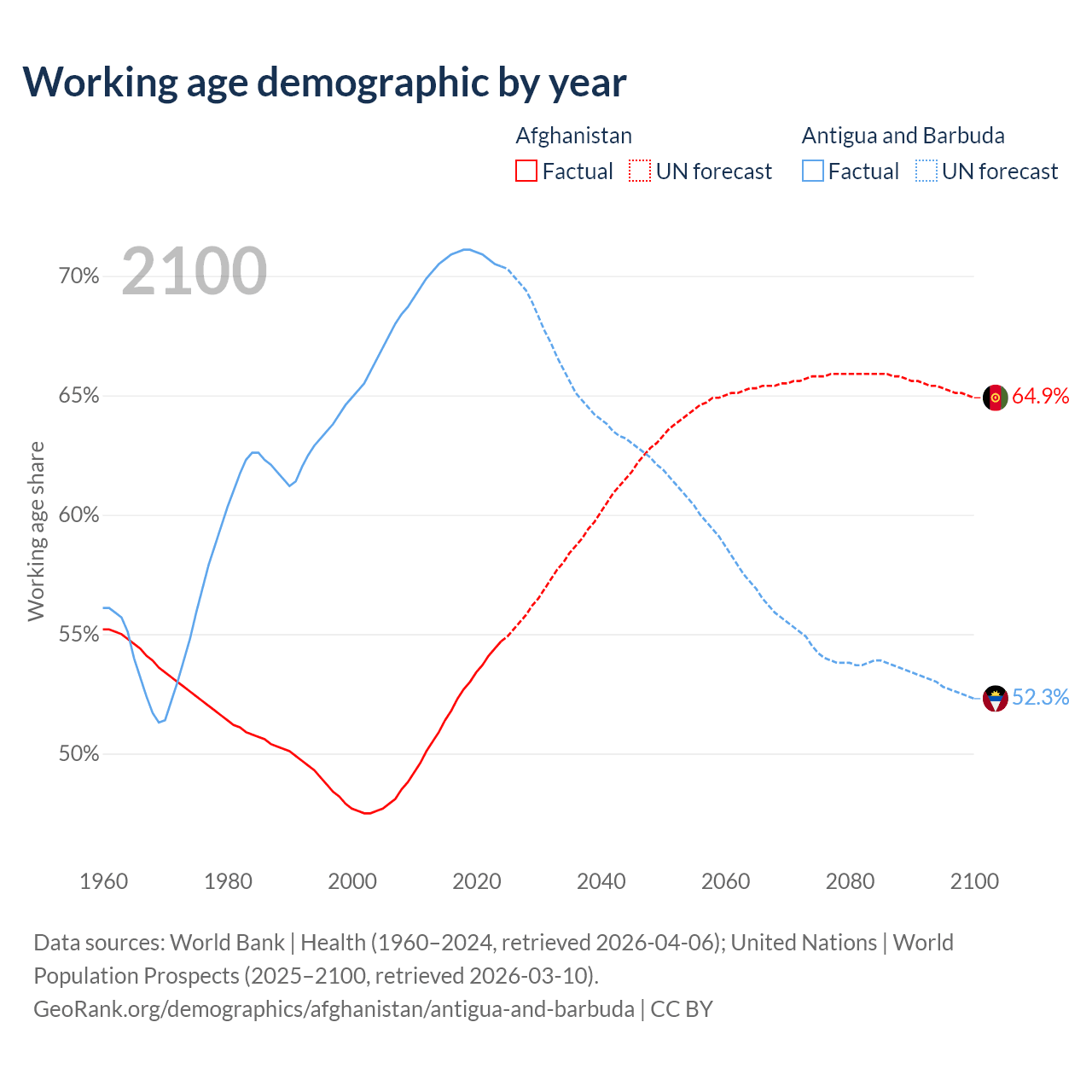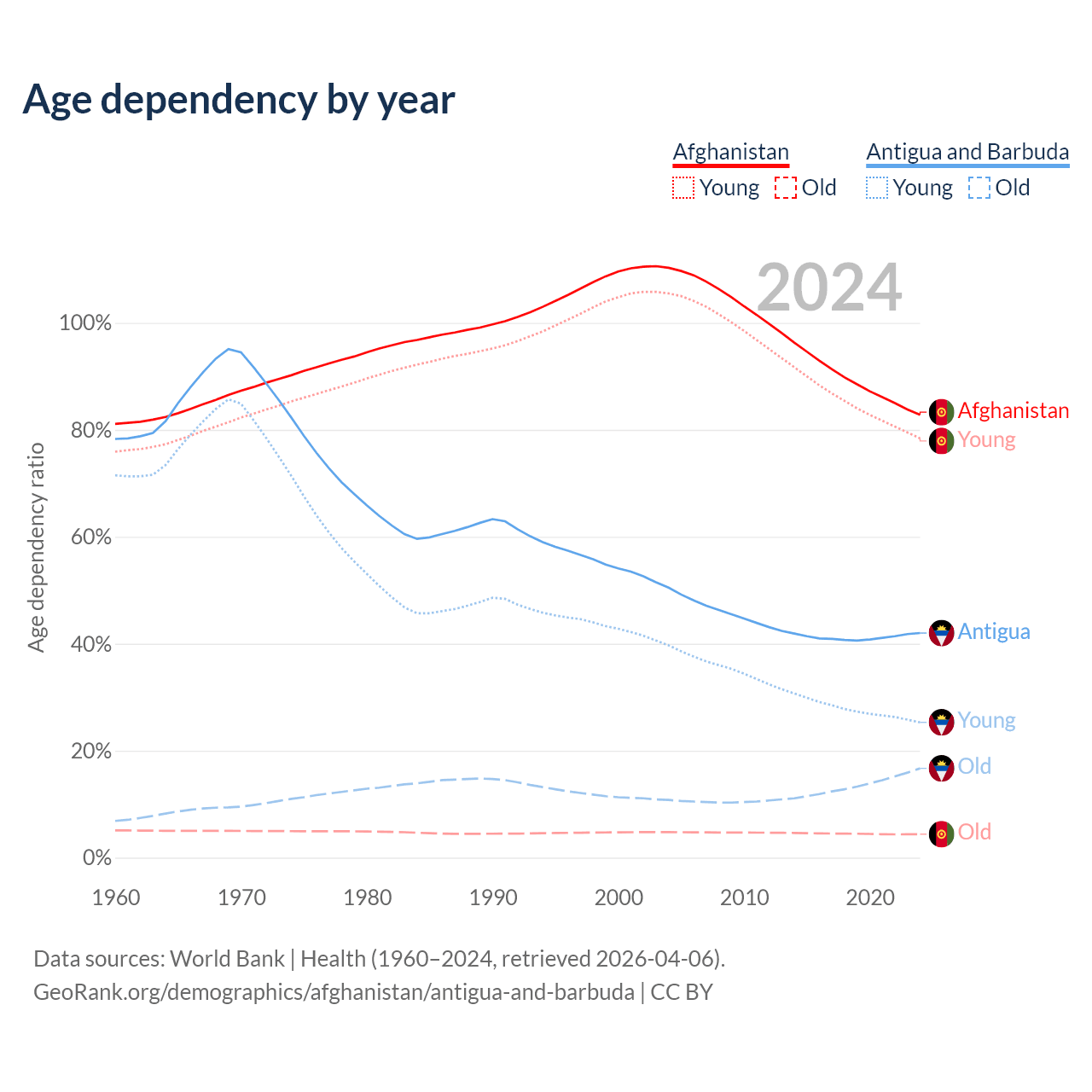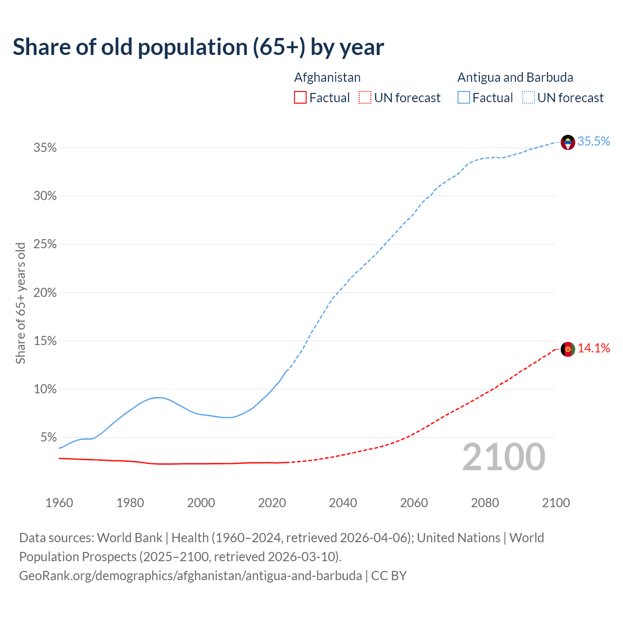The share of older people aged 65 and over is 2.4% in Afghanistan and 11.8% in Antigua and Barbuda. Life expectancy in Afghanistan compared to Antigua and Barbuda .