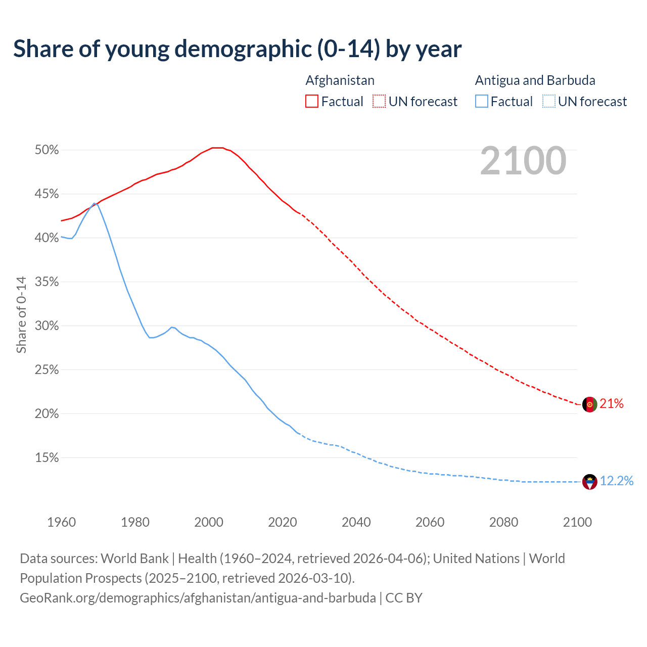 - The share of young demographic (0-15 years old) in Afghanistan is 42.9% vs 17.8% in Antigua and Barbuda.