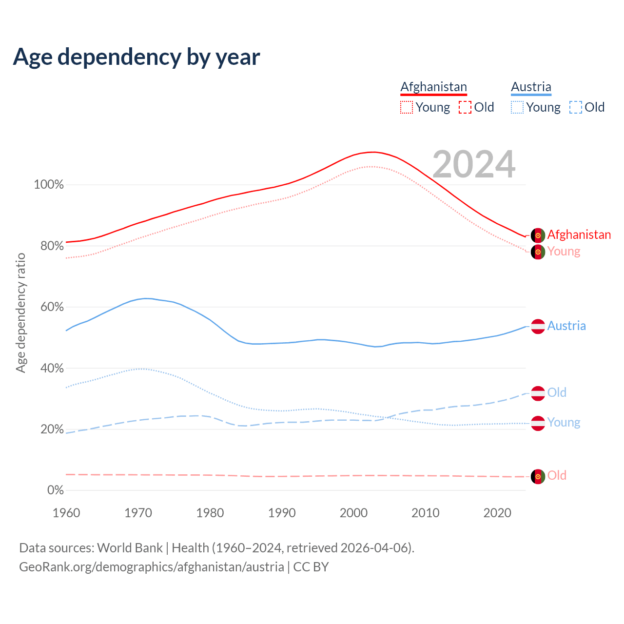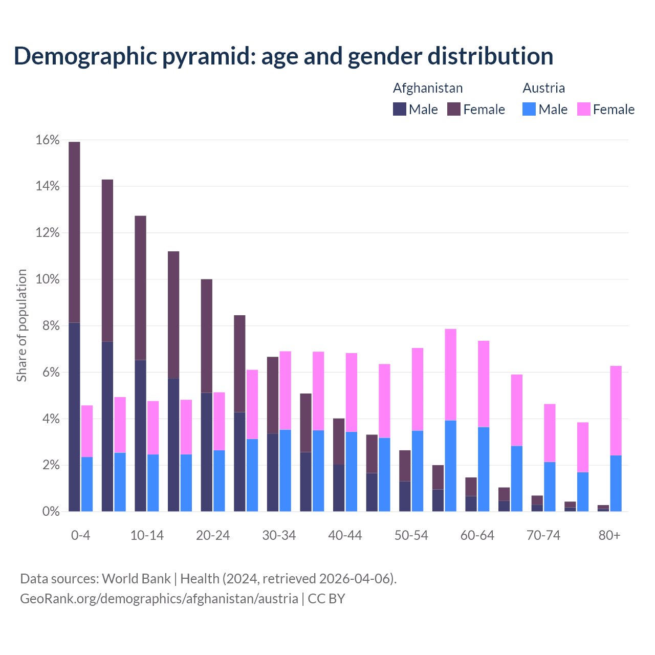 - The share of old-age demographic (65+) in Afghanistan is 2.4% vs 20.6% in Austria.