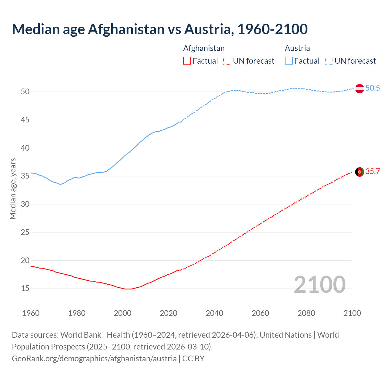 - Afghanistan is ranked 186/196 by median age (oldest to youngest) vs 19/196 for Austria.