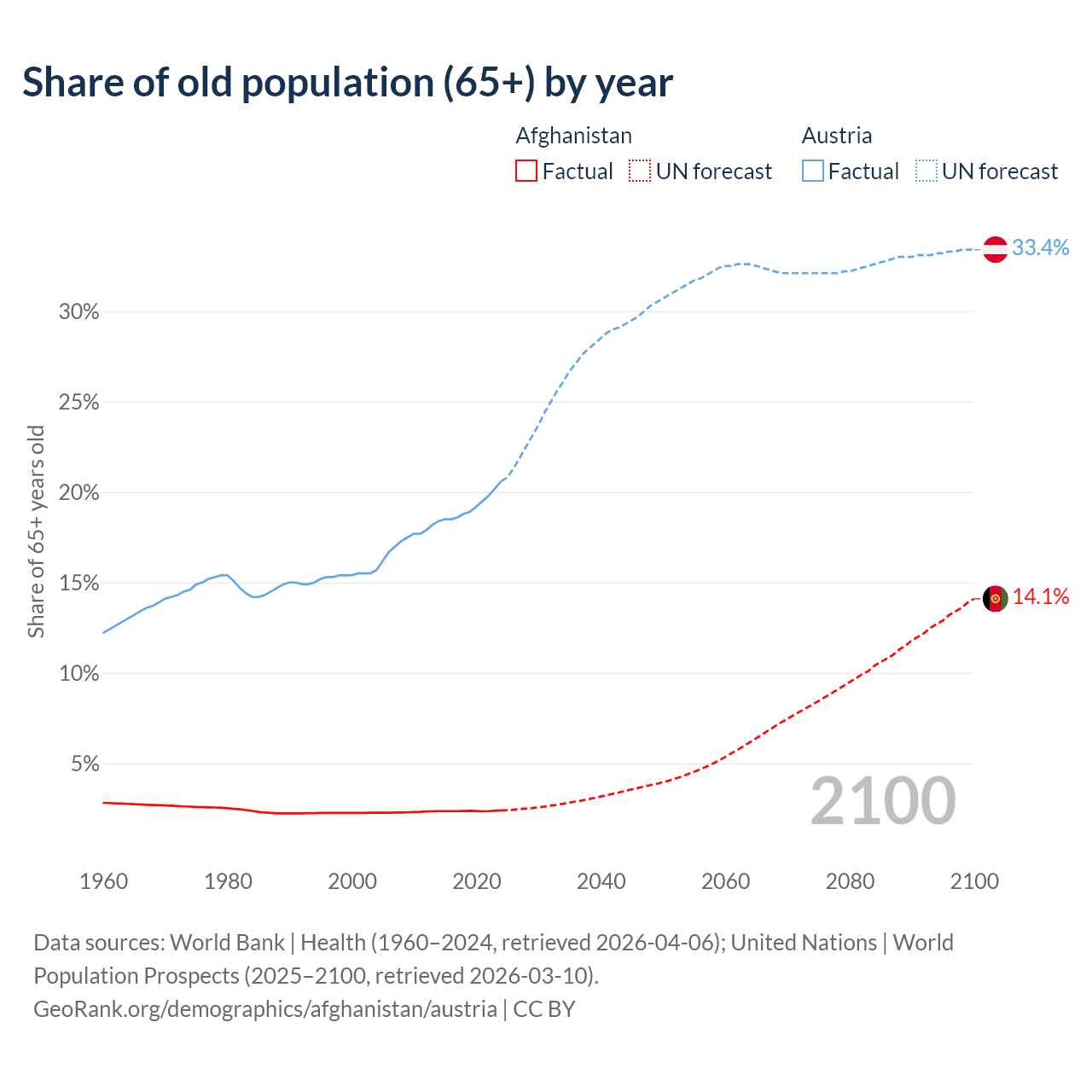 The share of older people aged 65 and over is 2.4% in Afghanistan and 20.6% in Austria. Life expectancy in Afghanistan compared to Austria .