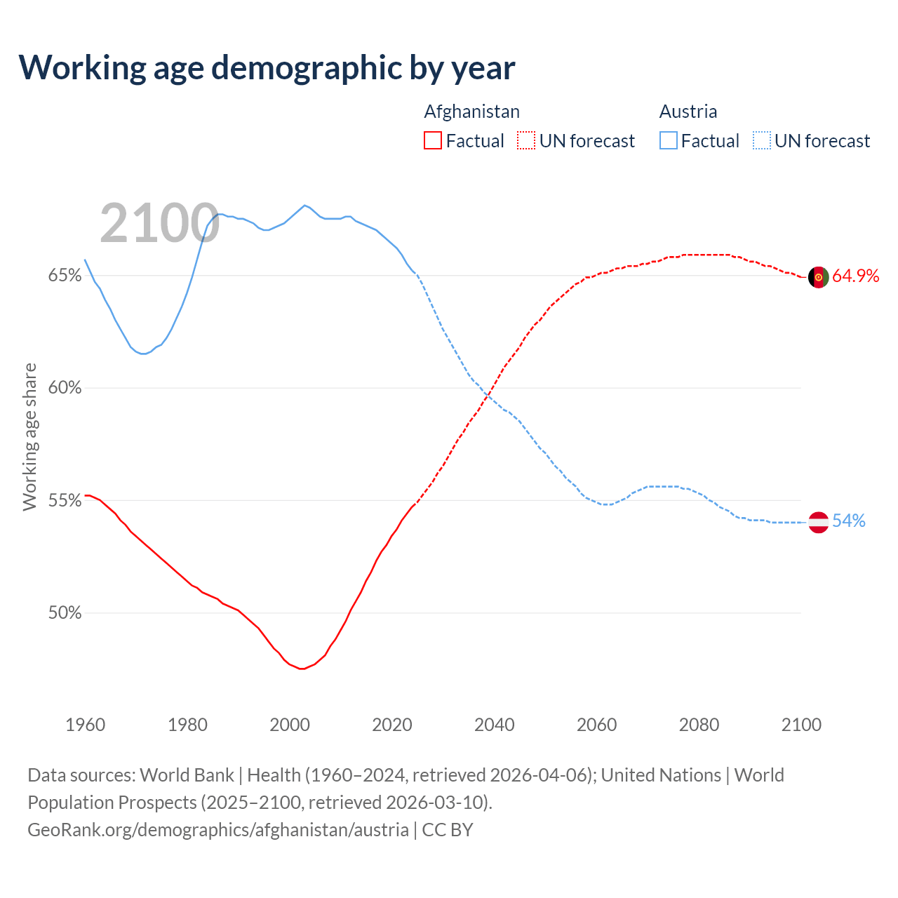 - Afghanistan has 24.8M working age adults (aged 15-64) vs 5.97M in Austria.