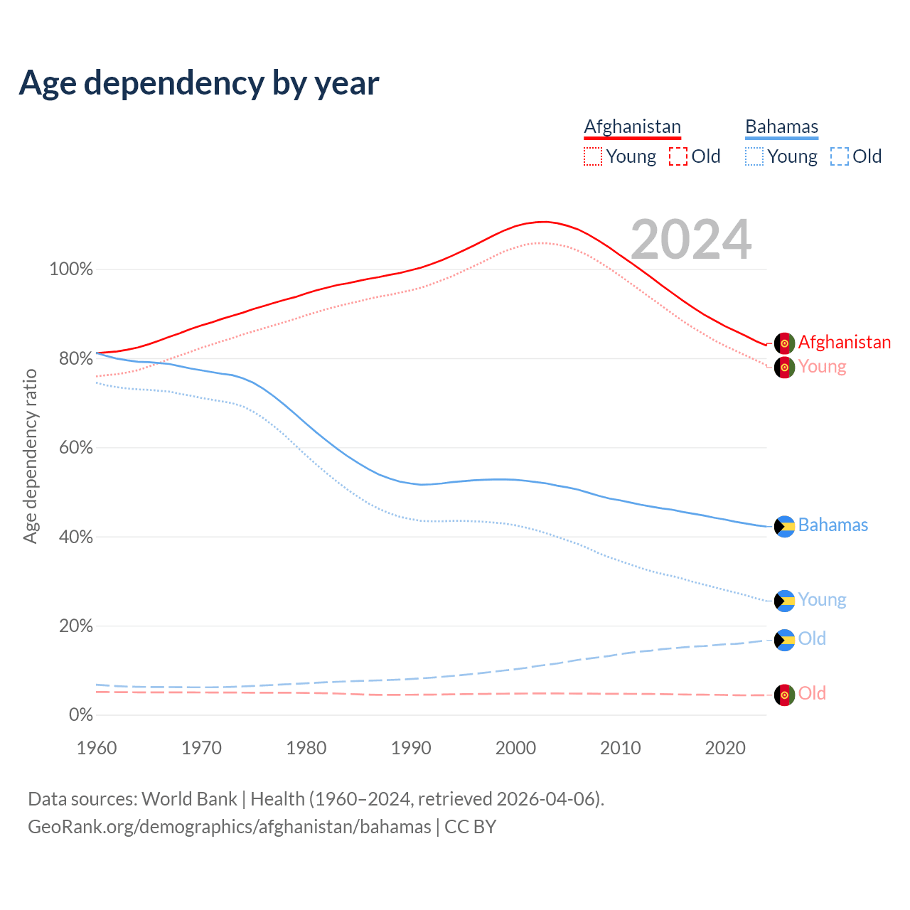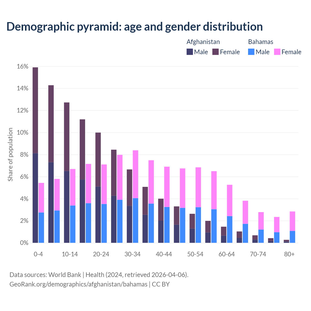 - Afghanistan is ranked 186/196 by median age (oldest to youngest) vs 70/196 for the Bahamas.